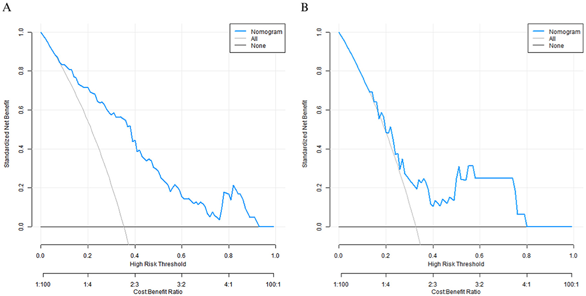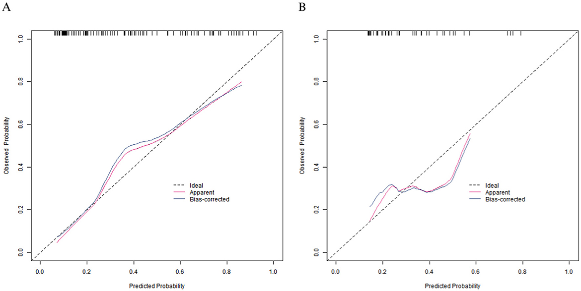 In the training set, the C-index of the calibration curve was 0.834 and the Brier score was 0.158. The P-value obtained from Hosmer-Lemeshow test was 0.604, indicating a good fit of the model. The ROC curve showed an AUC of 0.834 (95% CI: 0.760–0.908), with a sensitivity of 0.786 and a specificity of 0.792. In the validation set, the C-index was 0.703, the Brier score was 0.193, the P-value of Hosmer Lemeshow test was 0.349, the area under the ROC curve was 0.703 (95% CI: 0.539–0.866), and the sensitivity and specificity were 0.562 and 0.727, respectively. The calibration curve and the ROC curve are shown in Figures 2, 3.