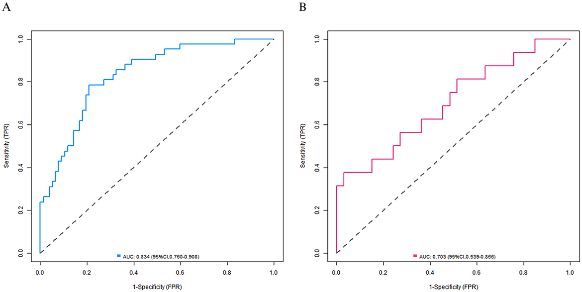 Figure 3. Receiver operating characteristic curves in the training set (A) and the validation set (B).