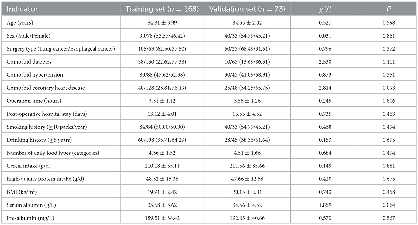 A total of 241 elderly patients, who were randomized 7:3 into training (n = 168) and validation (n = 73) sets, were admitted. No significant differences were found in indicators such as age, gender, surgical type, and comorbidities between the training set and the validation set (all P > 0.05), indicating comparability (Table 1).