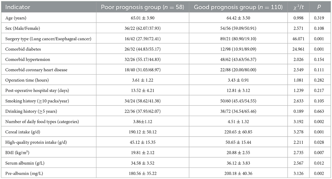 In the training set, patients were divided into the poor prognosis group (n = 58) and the good prognosis group (n = 110). The result of univariate analysis showed that there were significant differences in indicators such as surgery type, comorbid diabetes, number of daily food types, cereal intake, and high-quality protein intake, BMI, serum albumin and pre-albumin (all P < 0.05; Table 2).