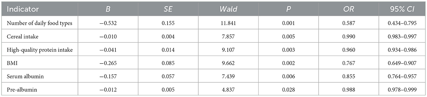 The prognostic effect is the dependent variable (poor prognosis = 1, good prognosis = 0), and variables with P < 0.05 in univariate analysis are used as covariates. The results of multiple logistic regression analysis showed that the higher the number of daily food types, grains, and high-quality protein, the higher the BMI, and the higher the serum albumin and pre-albumin levels were associated with the lower the risk of postoperative malnutrition in elderly patients (all P < 0.05; Table 3).