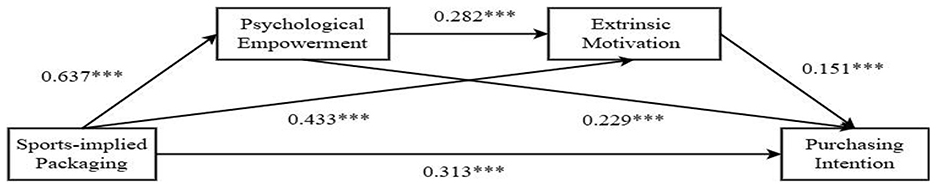 This study revealed how product packaging type influences Generation Z's purchase intention by conducting a chained mediation analysis, focusing on the mediating pathways of psychological empowerment and internal or external motivation. The results showed that sports-implied packaging enhances consumers' psychological empowerment, strengthening their intrinsic motivation and significantly promoting purchase intention. This partially supports Hypothesis H2a. Additionally, psychological empowerment indirectly influences purchase intention through extrinsic motivation, validating Hypothesis H2b. Notably, the comparison of indirect effects revealed that intrinsic motivation plays a stronger mediating role than extrinsic motivation, indicating that psychological empowerment is more likely to drive purchase intention by activating intrinsic rather than extrinsic motivators. This finding provides empirical evidence for Hypothesis H3. The results emphasize the critical role of psychological empowerment in marketing strategies and suggest that companies should enhance consumers' psychological empowerment through packaging design, particularly by activating their intrinsic motivation to improve conversion rates.