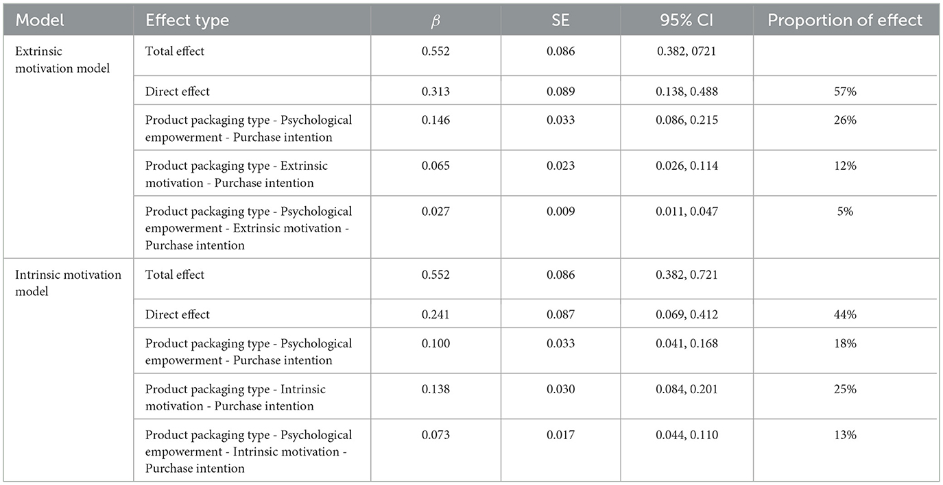 Test of psychological empowerment and intrinsic motivation as chained mediators: we used product packaging type as the independent variable, purchase intention as the dependent variable, and intrinsic motivation and psychological empowerment as mediating variables. We applied Process Model 6 to test the chained mediating roles of intrinsic motivation and psychological empowerment (Bootstrap sample: 5,000) (44). Model 6 of the PROCESS Macro is to analyze the chain (sequence) mediation effect. It allows the examination of whether an independent variable influences the specific path of the dependent variable by affecting the first mediating variable, which in turn affects the second mediating variable. The core output is the confidence intervals of key indirect effects, in particular X → M1 → M2 → Y, calculated by the Bootstrap method to determine whether the path is significant. After controlling for health consciousness, the results indicated that the type of product packaging had a significant impact on psychological empowerment [β = 0.637, 95% CI = (0.481, 0.794), P < 0.001] and intrinsic motivation [β = 0.451, 95% CI = (0.301, 0.601), P < 0.001]; product packaging type also significantly influenced purchase intention [β = 0.241, 95% CI = (0.069, 0.412), P < 0.001]. Psychological empowerment significantly influenced intrinsic motivation [β = 0.376, 95% CI = (0.302, 0.449), P < 0.001) and purchase intention [β = 0.157, 95% CI = [0.069, 0.246], P < 0.001). Intrinsic motivation also significantly influenced purchase intention [β = 0.305, 95% CI = (0.215, 0.395), P < 0.001]. Overall, the path from product packaging type → psychological empowerment → intrinsic motivation → purchase intention was significant [β = 0.073, SE = 0.017, 95% CI = (0.044, 0.110)], as shown in Figure 3. Therefore, psychological empowerment and intrinsic motivation partially mediated the relationship between sports-implied packaging of protein products and Generation Z's purchase intention, validating Hypothesis H2a.