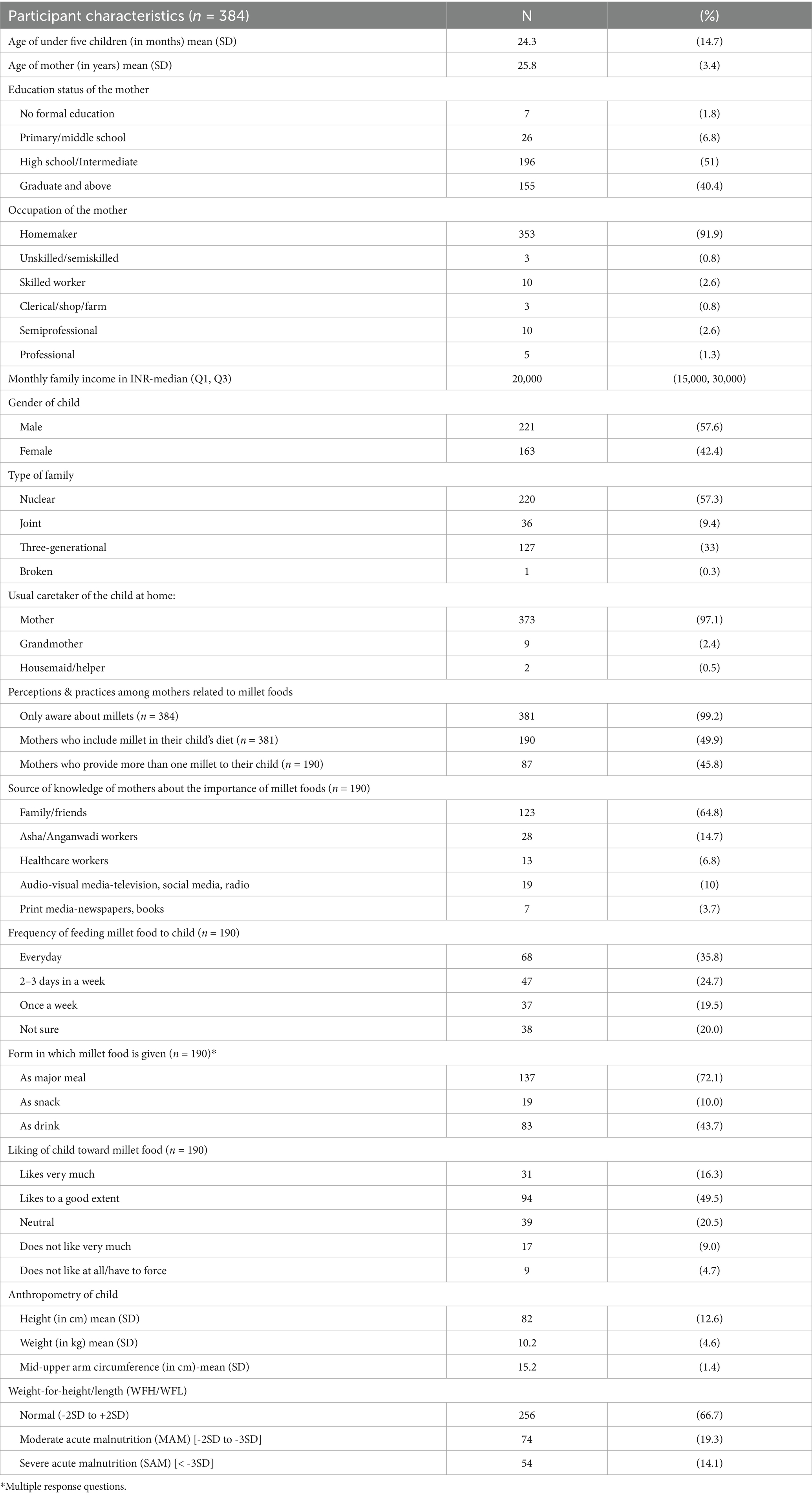 Mothers of children aged 6–59 months visiting the Pediatrics Outpatient Department (OPD) at AIIMS Bibinagar, Telangana, were approached for consent and requested to share their child feeding practices. Mothers of children with severe illness, those requiring inpatient admission, children with malabsorption syndromes, congenital anomalies, and developmental delays were excluded as their anthropometric parameters would have been affected by the illness or their long-term health conditions. Assuming that at least 50% of the mothers would provide millet-based food in any form for their under-five children, with 5% absolute precision and 95% confidence interval, the sample size was calculated as 384. The footfall of the pediatric OPD during the study period was 80–100 per day, and the OPD services are available from Monday to Saturday from 9 a.m. to 1 p.m. Systematic random sampling with a class interval of five was used to enroll the participants. The class interval was decided based on the previous OPD footfall, and the children were enrolled based on the sequence they were registered in the pediatric OPD for consultation and their age category. If the eligible child identified from the register was not willing to participate in the study next eligible child was approached to participate in the study. A pre-tested, semi-structured questionnaire was employed to collect information among mothers of under-five children regarding socio-demographic details like age, gender, mother’s education, occupation, knowledge, and existing practices on including millets in the daily diet of children, feeding frequency, and formulation of millet food given to children. Data for practices related to millet inclusion in children’s diet were collected with respect to the last 1-month period to reduce recall bias. The children’s anthropometric parameters (height, weight, and mid-upper arm circumference) were measured per WHO guidelines.
