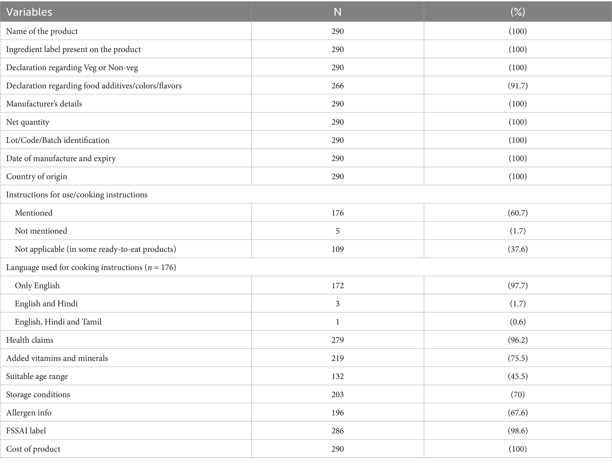 Information related to additives, flavoring and coloring was present on most (91.7%) products, with 73.8% of the products claiming to have no added flavors and/or colors. Instructions for cooking, excluding RTE foods, were mentioned on 97.2% of the products. These instructions were written in English on all products, and were written in Hindi and Tamil in 2.3 and 1.1% of the products, respectively. Food Safety and Standards Authority of India (FSSAI) label was present on 98.6% of the products while an organic certification was present on 29.6% products. Fortification was mentioned on the packaging of two products, however not much information was given on the details of the fortified item. Storage conditions were detailed on 93.1% of the products while allergen information was present on 66.6% of the products. Manufacturer’s details, date of manufacture and expiry were mentioned on all the products. Product labeling was compared with ‘Labeling requirements’ as suggested by Food Safety and Standards (Labeling and Display) Regulations, 2020 and is described in Table 4.