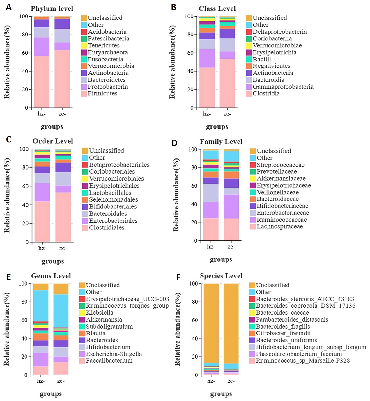 Figure 1. Differences in gut microbiota composition between patients with obesity (hz) and normal controls (zc). Relative abundance profiles of the gut microbiota at various taxonomic levels. Significant differences in abundance were observed in phyla such as Proteobacteria, Firmicutes, and Bacteroidetes. Differences were assessed using Welch's t-test for taxonomic comparisons; an adjusted p-value of < 0.05 was considered significant. (A) Phylum level; (B) Class level; (C) Order level; (D) Family level; (E) Genus level; (F) Species level.