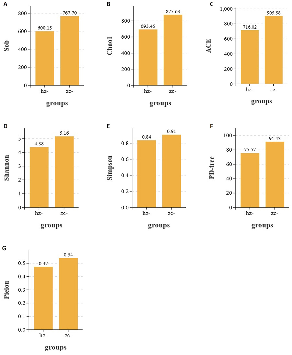 Figure 2. Alpha diversity indices of the gut microbiota in the obesity (hz) and control groups (zc). Sobs, Chao1, ACE, Shannon, Pielou, and PD-tree index values were significantly lower in the obesity group than in the control group (p < 0.05), whereas the Simpson index remained unchanged (p > 0.05). This indicated that richness, evenness, and phylogenetic diversity were reduced in patients with obesity. (A) Sobs; (B) Chao1; (C) ACE; (D) Shannon; (E) Simpson; (F) PD tree; (G) Pielou.
