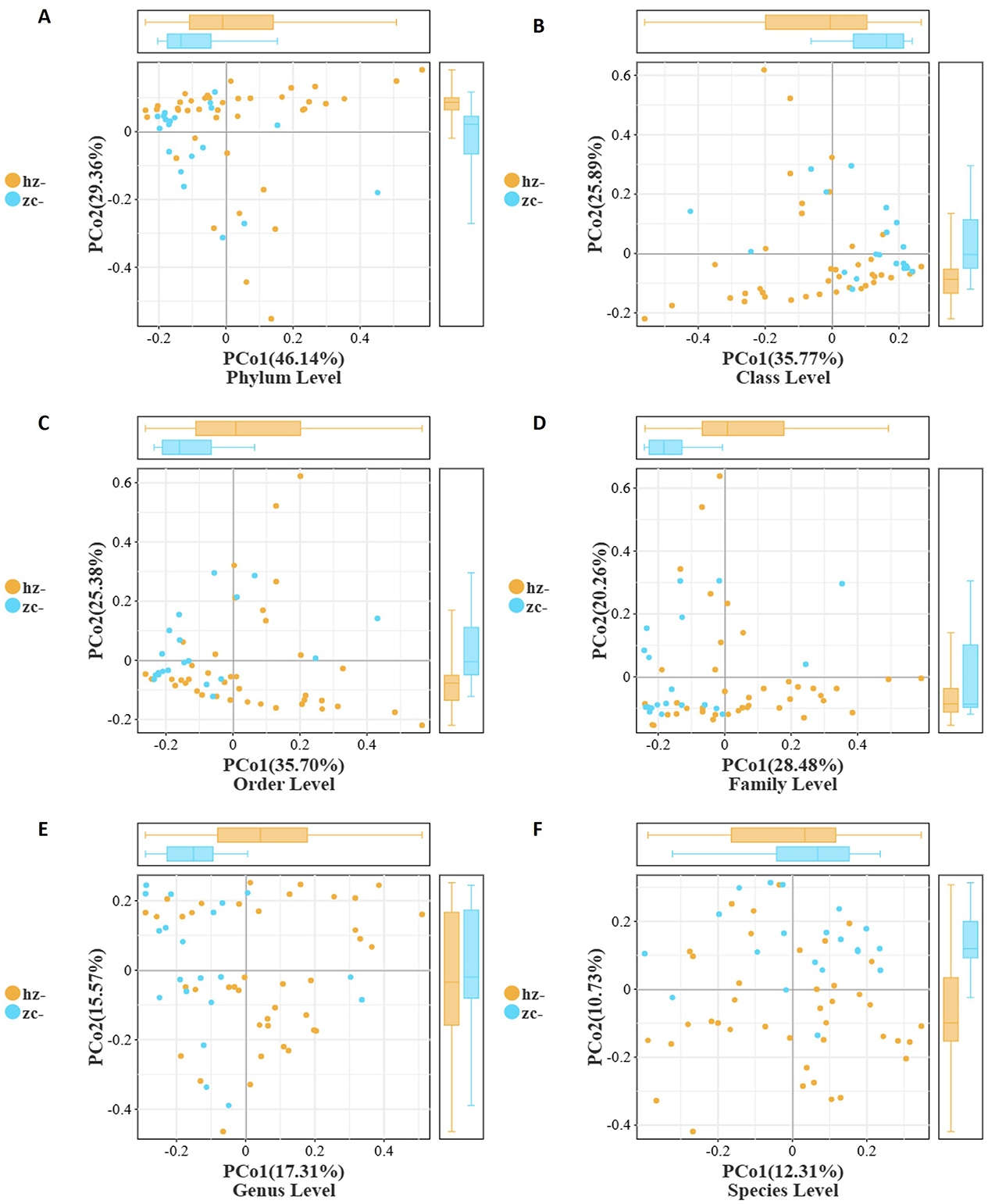 Figure 3. Beta-diversity of the gut microbiota between patients with obesity (hz) and healthy controls (zc) based on Bray–Curtis distances. PCoA plots show a clear separation between the two groups from the phylum to the order level, with the obesity group exhibiting greater heterogeneity. Boxplots further confirmed significant differences in PCo1/PCo2 distributions, while separation became less pronounced at finer taxonomic levels. (A) Phylum Level; (B) Class Level; (C) Order Level; (D) Family Level; (E) Genus Level; (F) Species Level.