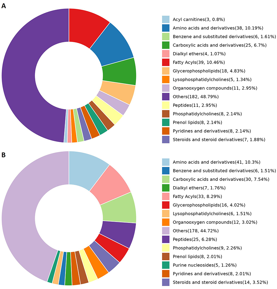 Figure 4. Metabolite categories displaying differential abundance between the obesity and control groups. (A) The relative abundance of differential metabolite categories between patients in Group A (characterized by liver qi stagnation and spleen deficiency) and healthy controls. (B) The relative abundance of differential metabolite categories between patients in Group B (characterized by blood stasis and phlegm retention) and healthy controls. The color blocks on the right indicate metabolite categories. Differential metabolites were identified using multivariate analysis with the criteria VIP > 1.0, |log2FC| ≥ 0.5, and FDR < 0.05.