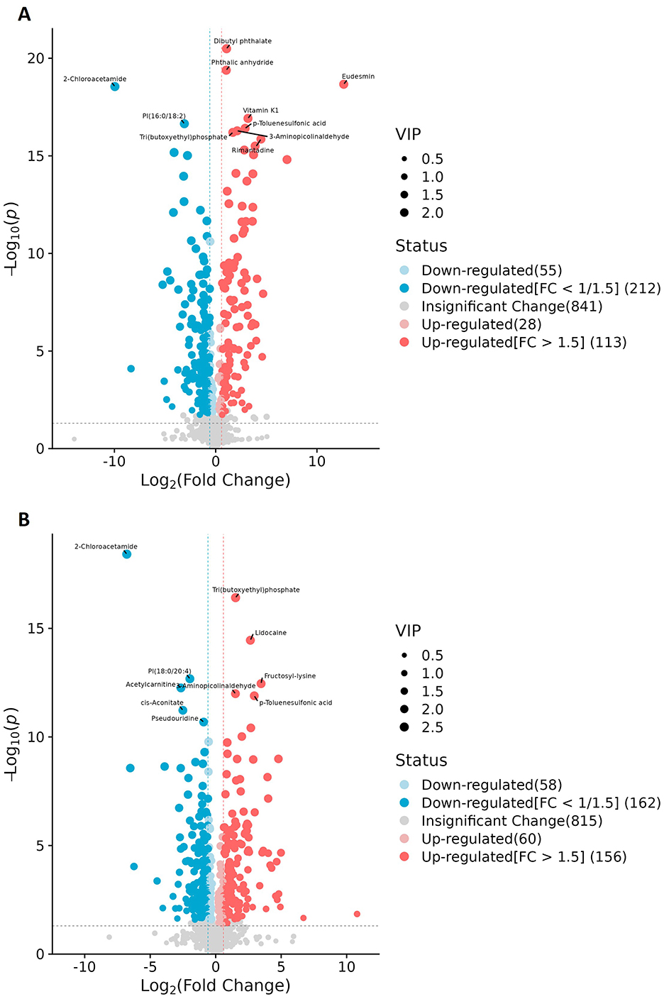 Figure 5. Volcano plots of the differential metabolites. (A) Patients in Group A (characterized by liver qi stagnation and spleen deficiency) vs. healthy controls. (B) Patients in Group B (characterized by blood stasis and phlegm retention) vs. healthy controls. Each dot represents a metabolite (x-axis: log2FC, y-axis: –log10p); dot size indicates VIP score. Blue and red denote down- and upregulated metabolites, respectively, while gray indicates no significant change.