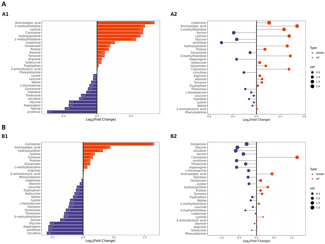 Figure 6. Targeted amino acid metabolomic profiling by LC–MS in patients with obesity and healthy controls. (A) Group A vs. controls. (A1) Bar plot of amino acids ranked by log2FC in Group A; the x-axis shows log2FC, with positive values indicating higher levels, and negative values indicating lower levels. (A2) Bubble plot of the same features; the x-axis shows log2FC, bubble size reflects VIP, and color denotes up- or downregulation. (B) Group B vs. controls. (B1) Bar plot of amino acids ranked by log2FC for Group B. (B2) Bubble plot as in (A2) for Group B. Differential metabolites were defined using VIP > 1.0, |log2FC| ≥ 0.5, and FDR < 0.05 as the criteria.
