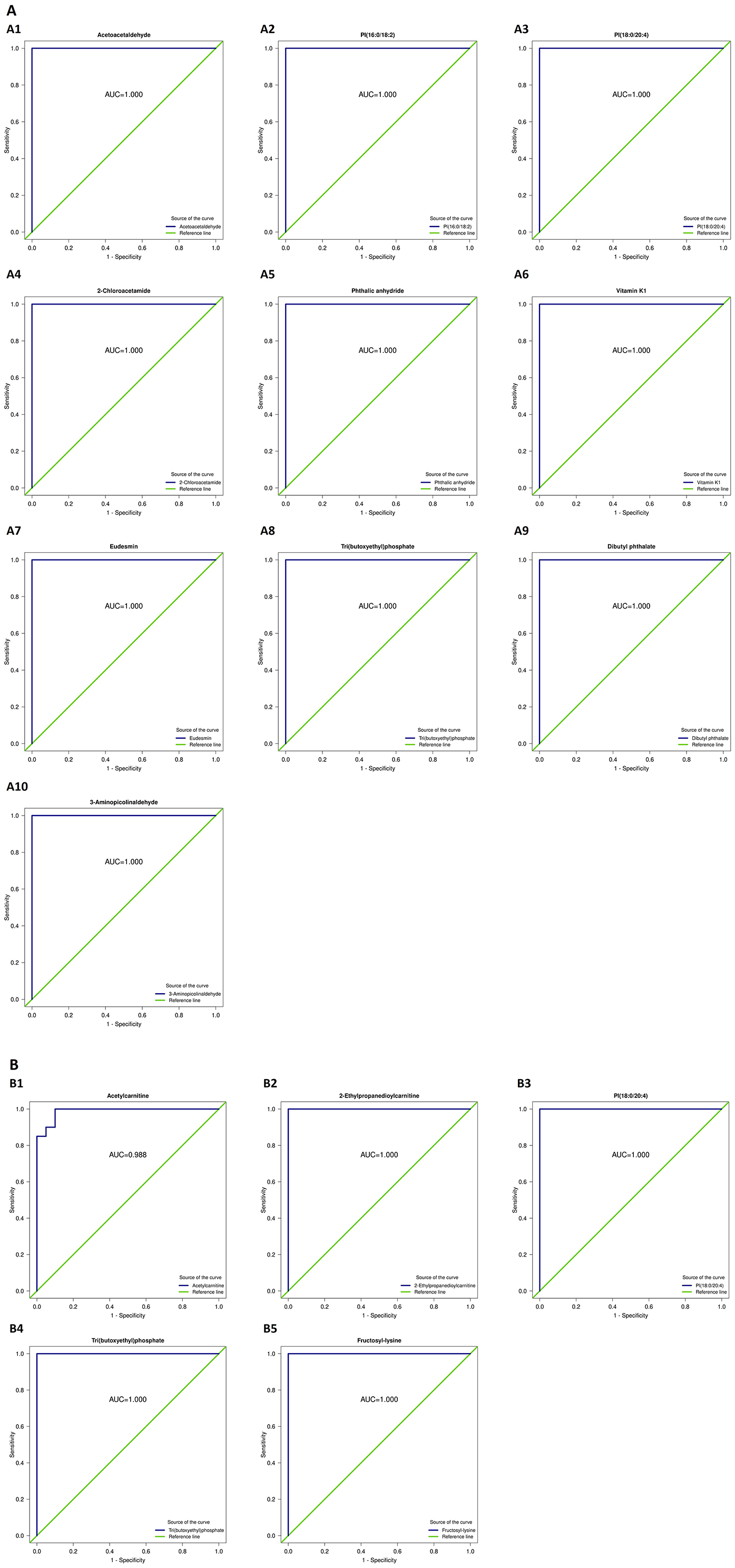 Figure 7. Receiver operating characteristic (ROC) curves of the differential metabolites capable of distinguishing patients with obesity from healthy controls. (A1) Acetoacetaldehyde; (A2) PI(16:0/18:2); (A3) PI(18:0/20:4); (A4) 2-Chloroacetamide; (A5) Phthalic anhydride; (A6) Vitamin K1; (A7) Eudesmin; (A8) Tri(butoxyethyl)phosphate; (A9) Dibutyl phthalate; (A10) 3-Aminoisobutyraldehyde; (B1) Acetylcarnitine; (B2) 2-Ethylpropanedioylcarnitine; (B3) PI(18:0/20:4); (B4) Tri(butoxyethyl)phosphate; (B5) Fructosyl-lysine.