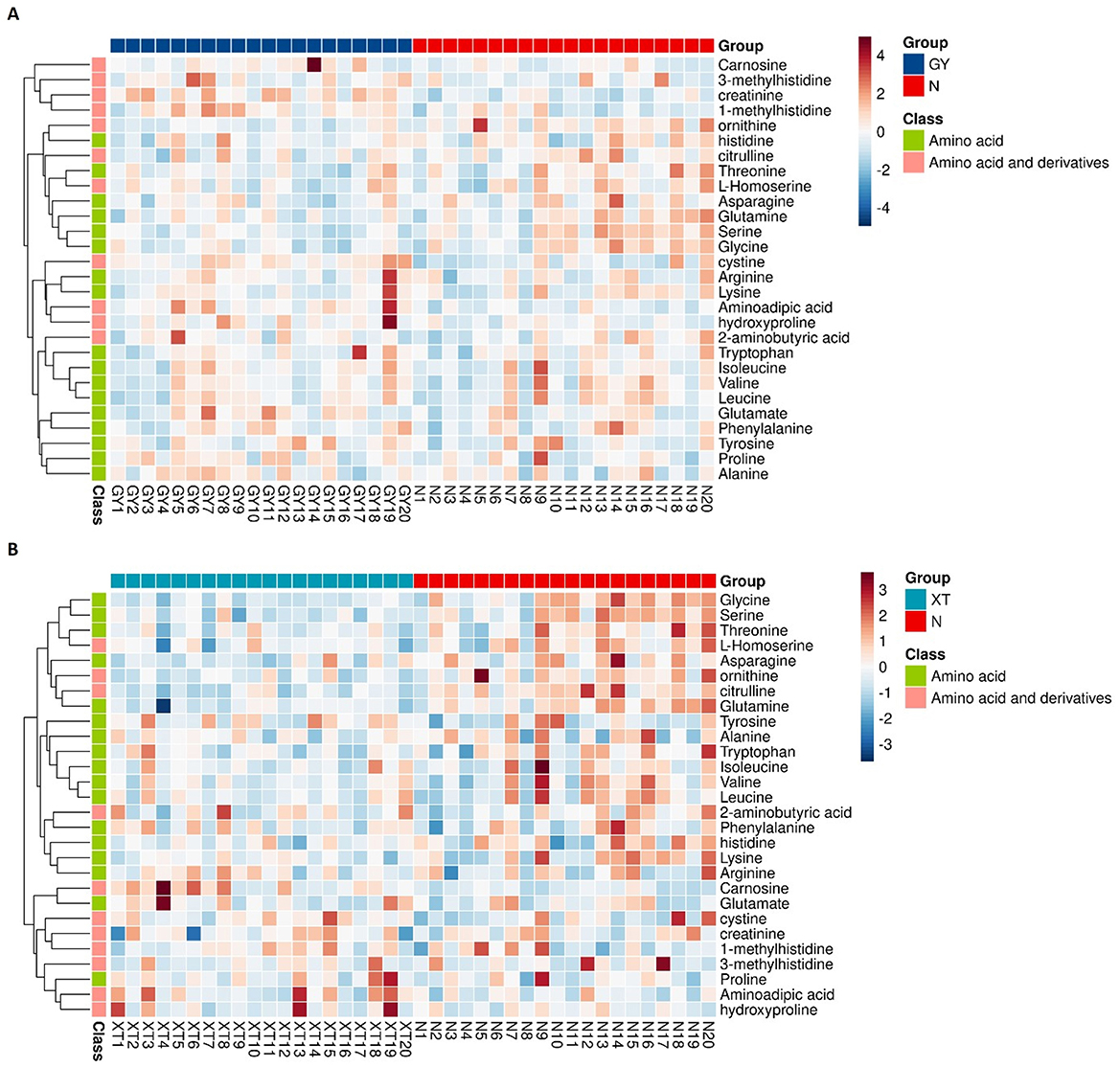 Figure 8. Heatmaps of targeted amino acid metabolomic profiles. (A) Group A vs. controls. Comparison of the targeted amino acid (and derivatives) metabolomic profiles between obesity cohort A (GY, n = 20) and healthy controls (N, n = 20). Rows are metabolites; columns are individual study participants. Values were row-standardized (Z-scores). Color scale: red denotes higher relative abundance, blue signifies lower relative abundance. The left dendrogram shows unsupervised hierarchical clustering; the side strip shows the chemical class (green: amino acid; pink: amino acid and derivatives). (B) Group B vs. controls. Comparison of the targeted amino acid (and derivatives) metabolomic profiles between obesity cohort B (XT, n = 20) and healthy controls (N, n = 20). Display conventions are identical to (A).
