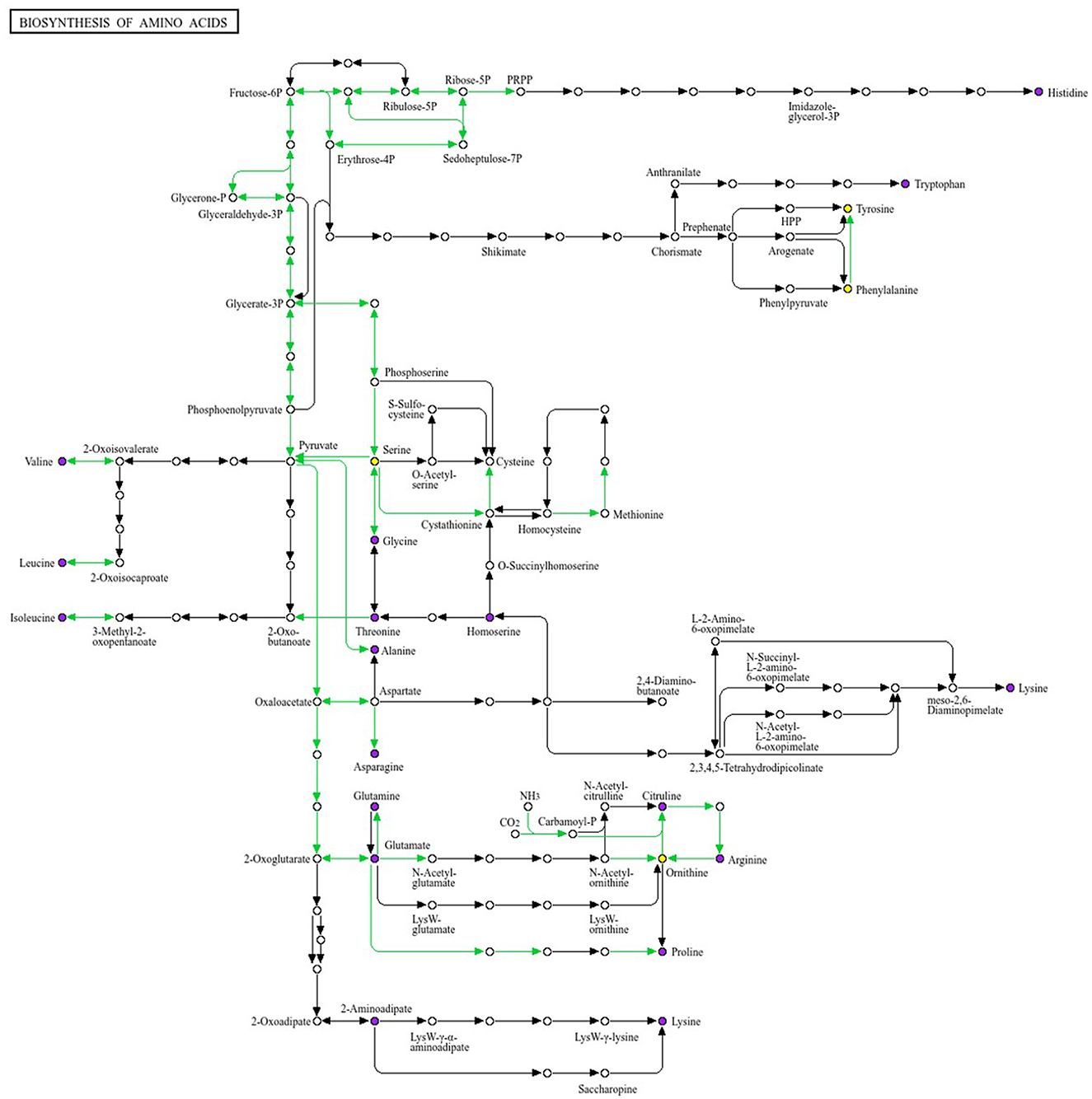 Figure 9. Mapping of the differential metabolites to the KEGG amino acid biosynthetic pathway (map01230). We selected the pathway with the largest number of enriched entries. This pathway diagram illustrates the modular architecture of the biosynthesis routes for 20 amino acids. Colored nodes denote metabolites identified as differentially abundant. In the between-group comparison, tryptophan,tyrosine, and glutamine show upward trends within the pathway, whereas valine, leucine and ornithine show downward trends. Differential abundance was defined using VIP > 1.0, |log2FC| ≥ 0.5, and FDR < 0.05 as criteria. KEGG enrichment analysis identified amino acid biosynthesis as the most enriched pathway.