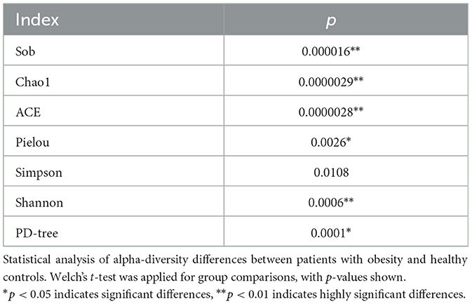 In studies on gut microbiota ecology, alpha diversity reflects the richness, evenness, and overall diversity of microbial communities within a sample. In this study, we assessed the differences between the obesity and control groups using several indices, including the Sobs, Chao1, ACE, Shannon, Simpson, PD-tree, and Pielou indices. The results demonstrated that, across all indices, the values observed in the obesity group were consistently lower than those in the healthy control group. This indicated that individuals with obesity exhibit reduced microbial diversity and evenness in their gut microbiota. These findings suggested that a strong correlation exists between gut microbial diversity and the development of obesity.