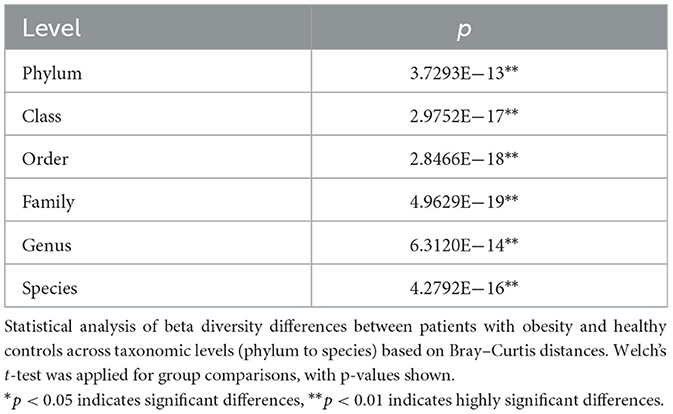 Collectively, these findings indicated that, compared with healthy individuals, patients with obesity displayed significant differences in gut microbial community structure, which were most pronounced at higher taxonomic levels and primarily captured by PCo1. The obesity group consistently exhibited greater heterogeneity and a rightward shift on PCo1, while the control group showed a systematic elevation on PCo2 starting from the class level. These patterns suggested that obesity-related alterations in the gut microbiota are more robust and stable at higher taxonomic ranks, whereas at the species level, differences are diminished, primarily reflecting variability in community distribution.