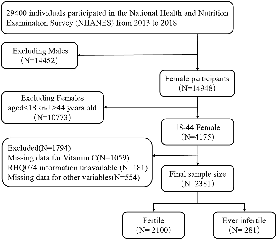 The analysis conducted in this study was based on data collected from the NHANES database (https://www.cdc.gov/nchs/nhanes/). As shown in Figure 1, inclusion criteria were as follows: 1. Female participants aged 18–44. 2. Statistical information on NHANES participants' fertility status (variable name: RHQ074), VC intake dietary recall interviews (variable name: DR1TVC, DR2TVC), and other covariates were collected in the NHANES database. Exclusion criteria were as follows: 1. participants lacking the dietary interview data on VC intake was excluded (N = 1,059). 2. A few participants were missing information about whether they were ever infertile (N = 181). 3. There was some unavailable data for other variables (N = 554). Eventually, 2,381 adult American females aged from 18 to 44 was included.