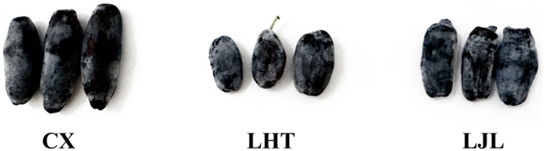 Three varieties of blue honeysuckle, namely Chaoxian (CX), Luohuotan (LHT), and Lanjingling (LJL), were selected for the experiment. All blue honeysuckle samples were harvested at full ripeness in mid-June from the same experimental orchard (Harbin, Heilongjiang, China) under consistent cultivation conditions. The three cultivars of blue honeysuckle exhibited distinct morphological differences (Figure 1). “CX” berries exhibitd a slender cylindrical shape, with average fruit length and width of approximately 2.3 cm and 1.3 cm, respectively; ‘LHT’ fruits were shorter, rounder, and oval-shaped, averaging approximately 1.5 cm in length and 0.9 cm in width; “LJL” fruits displayed intermediate length (about 2.1 cm long and 1.0 cm wide) with irregular morphology and slight flattening. Methanol, acetonitrile, and formic acid (chromatographically pure) were purchased from Kemio Chemical Tengda Biotechnology Co. (Xi’an, China). Potassium chloride and tartaric acid (analytical grade) were supplied by Merck KGaA (Darmstadt, Germany). Other reagents used were of analytical grade.