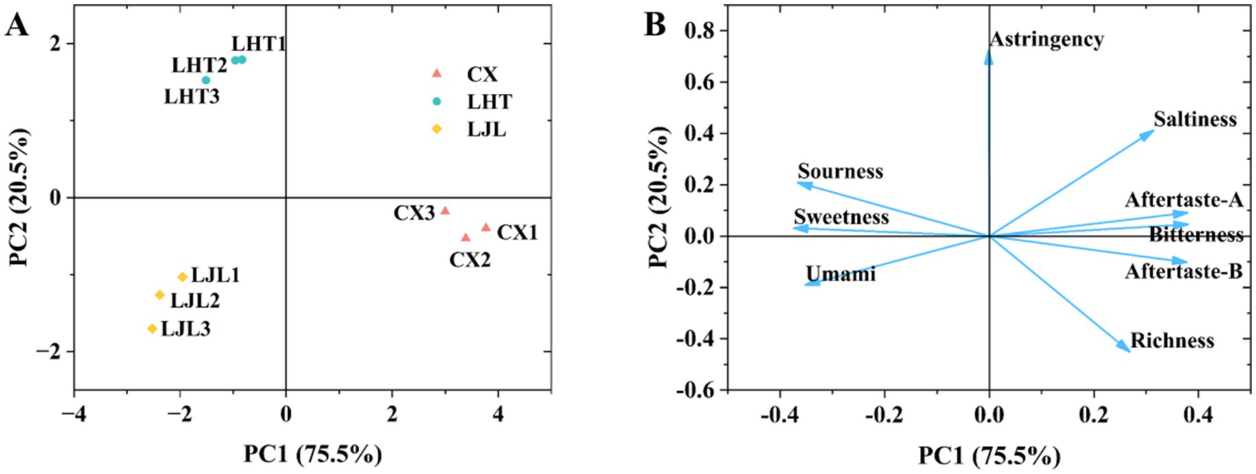 Panel A shows a PCA scatter plot with three groups: CX (red triangles), LHT (blue circles), and LJL (orange diamonds), plotted along PC1 (75.5%) and PC2 (20.5%). Panel B displays a biplot with flavor attributes like sourness, sweetness, and bitterness as vectors, each aligned with PC1 and PC2.