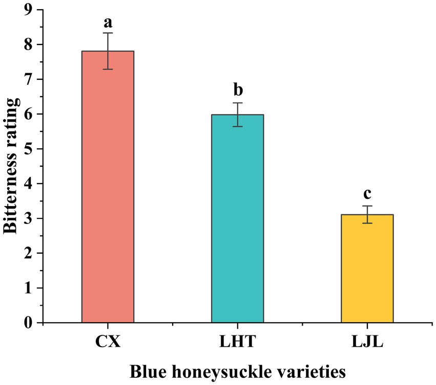 Figure 3. Bitter taste levels of three blue honeysuckle cultivars. Data represent mean ± standard deviation of three repeats. Different letters above the bars indicate significant differences.
