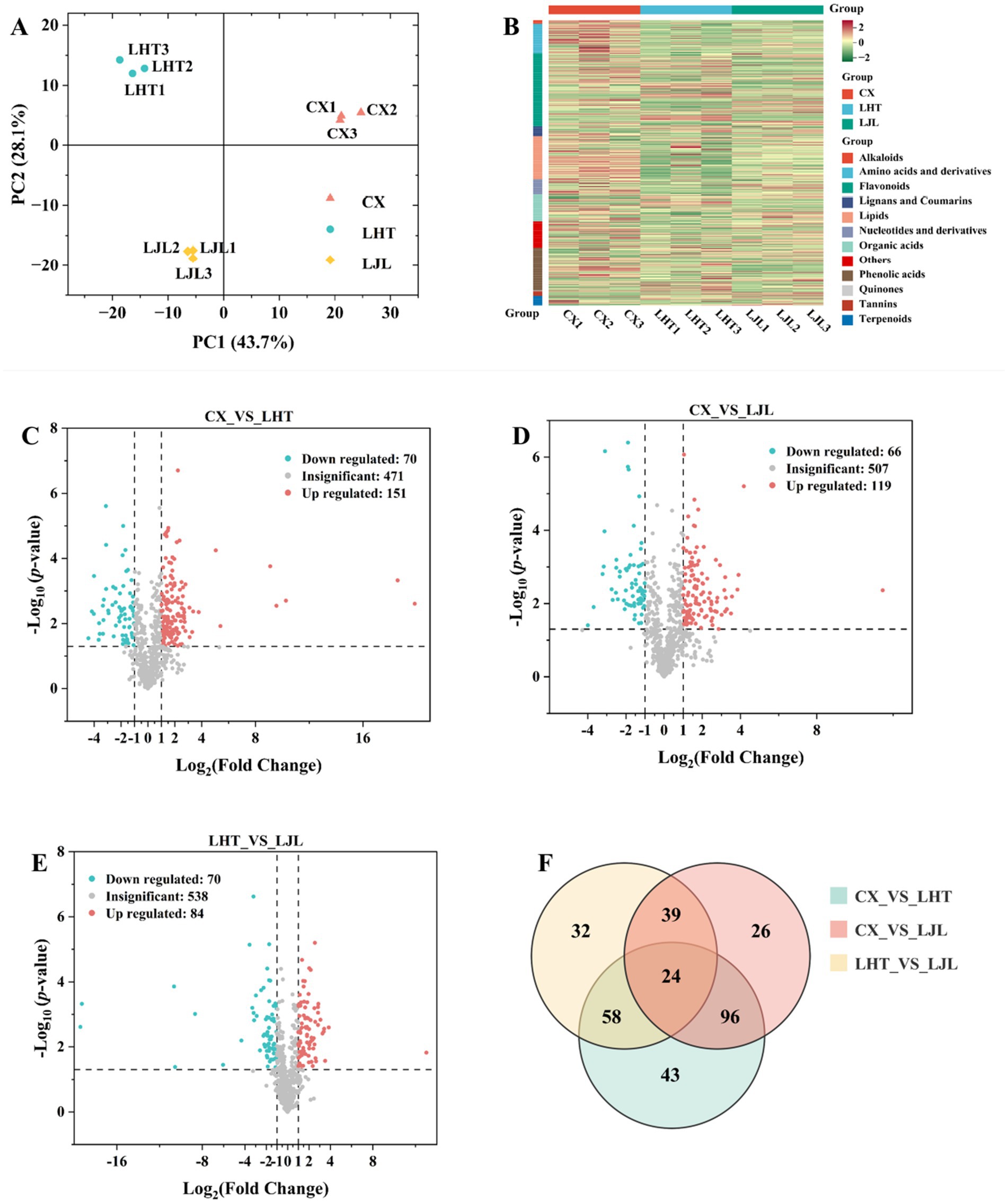 Figure 4. (A) PCA analysis of all metabolite profiles across different blue honeysuckle groups. (B) Hierarchical clustering heatmap of all metabolites in blue honeysuckle of three varieties. Red indicates a high relative content and green indicates a low relative content. (C–E) Volcano plot of differentially accumulated metabolites in blue honeysuckle with p ≤ 0.05 and |log2FC| ≥ 1 between (C) CX vs. LHT, (D) CX vs. LJL, (E) LHT vs. LJL. The red, green, and gray dots represent the up-regulated, down-regulated, and non-significantly differentially accumulated metabolites between the comparison groups, respectively. (F) Venn diagram of differentially accumulated metabolites among CX, LHT, and LJL.