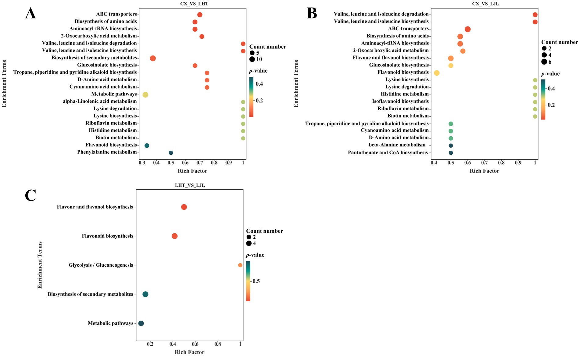 Figure 5. KEGG pathway analysis of differentially bitter metabolites in blue honeysuckle between (A) CX vs. LHT, (B) CX vs. LJL, (C) LHT vs. LJL.