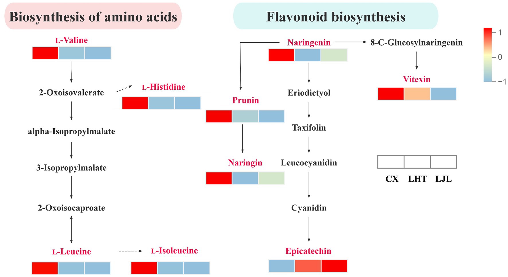 Figure 6. Differences in the biosynthesis of amino acids and flavonoid biosynthesis pathway bitter metabolites among CX, LHT, and LJL. The rectangles represent different varieties of blue honeysuckle. Colors are based on accumulation levels of metabolites, where red represents high accumulation and blue represents low accumulation.