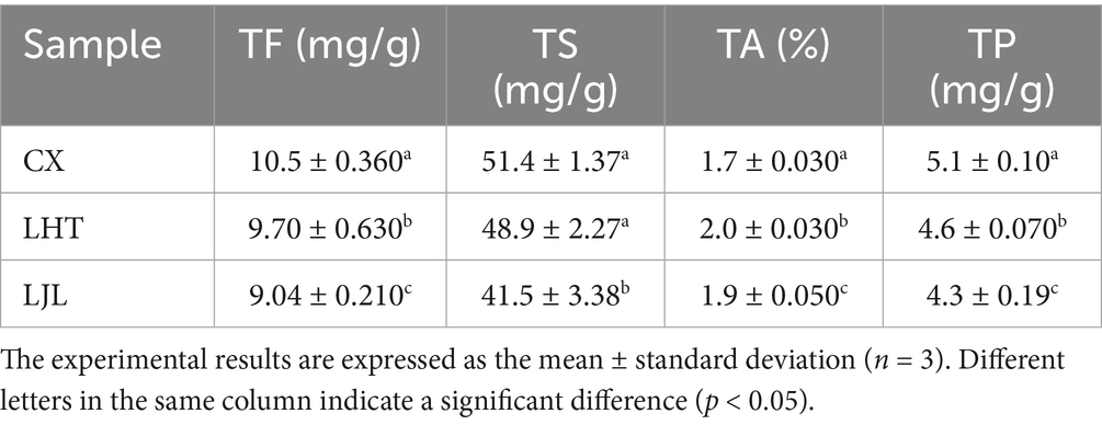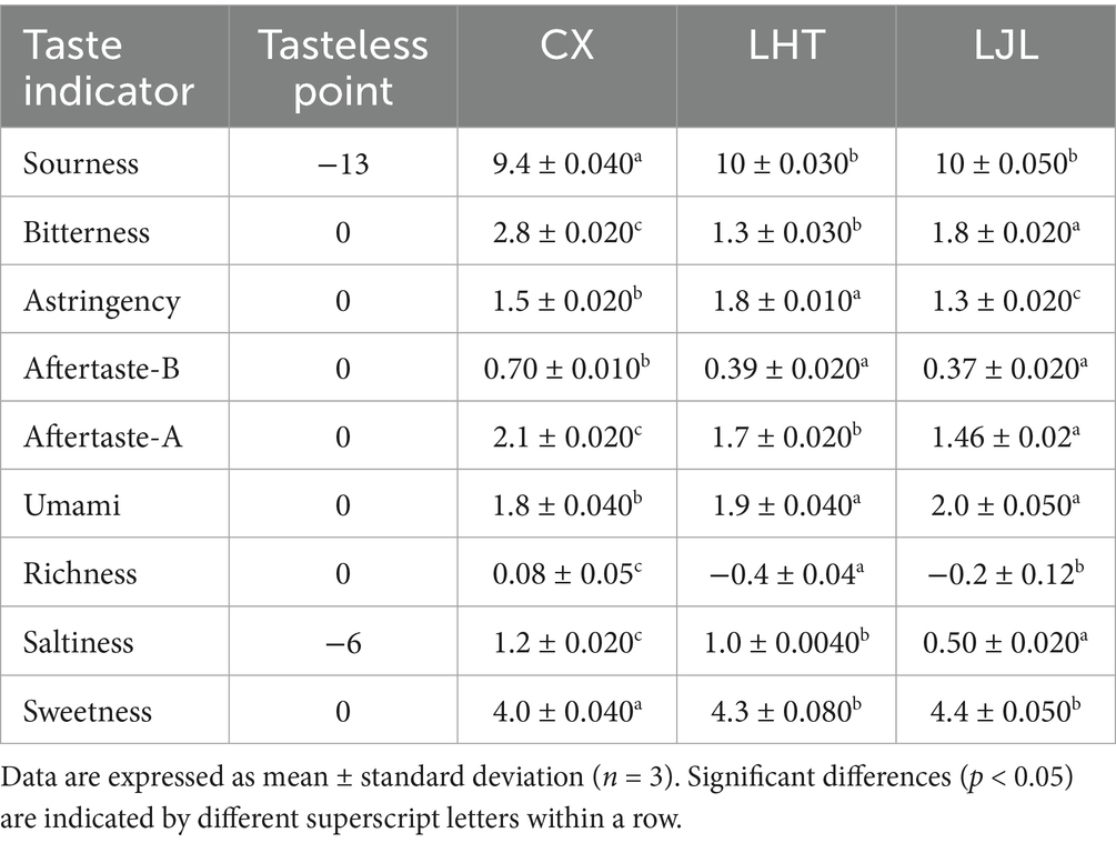 Flavonoids, sugars, and polyphenols were widely present in blue honeysuckle, as reported in previous studies (2, 8). The contents of TF, TS, TA, and TP of the three varieties of blue honeysuckle were shown in Table 1. Among the three cultivars, CX exhibited the highest contents of TF and TP, followed by LHT with intermediate values, while LJL showed the lowest contents of TF and TP. CX and LHT showed no significant difference in TS content, but both were significantly higher than LJL. In terms of TA content, the level in LHT was significantly higher than those in CX and LJL. These compositional differences are likely to influence the sensory characteristics of the cultivars, particularly the bitterness, as higher TF and TP contents have been associated with increased bitter taste intensity (24).