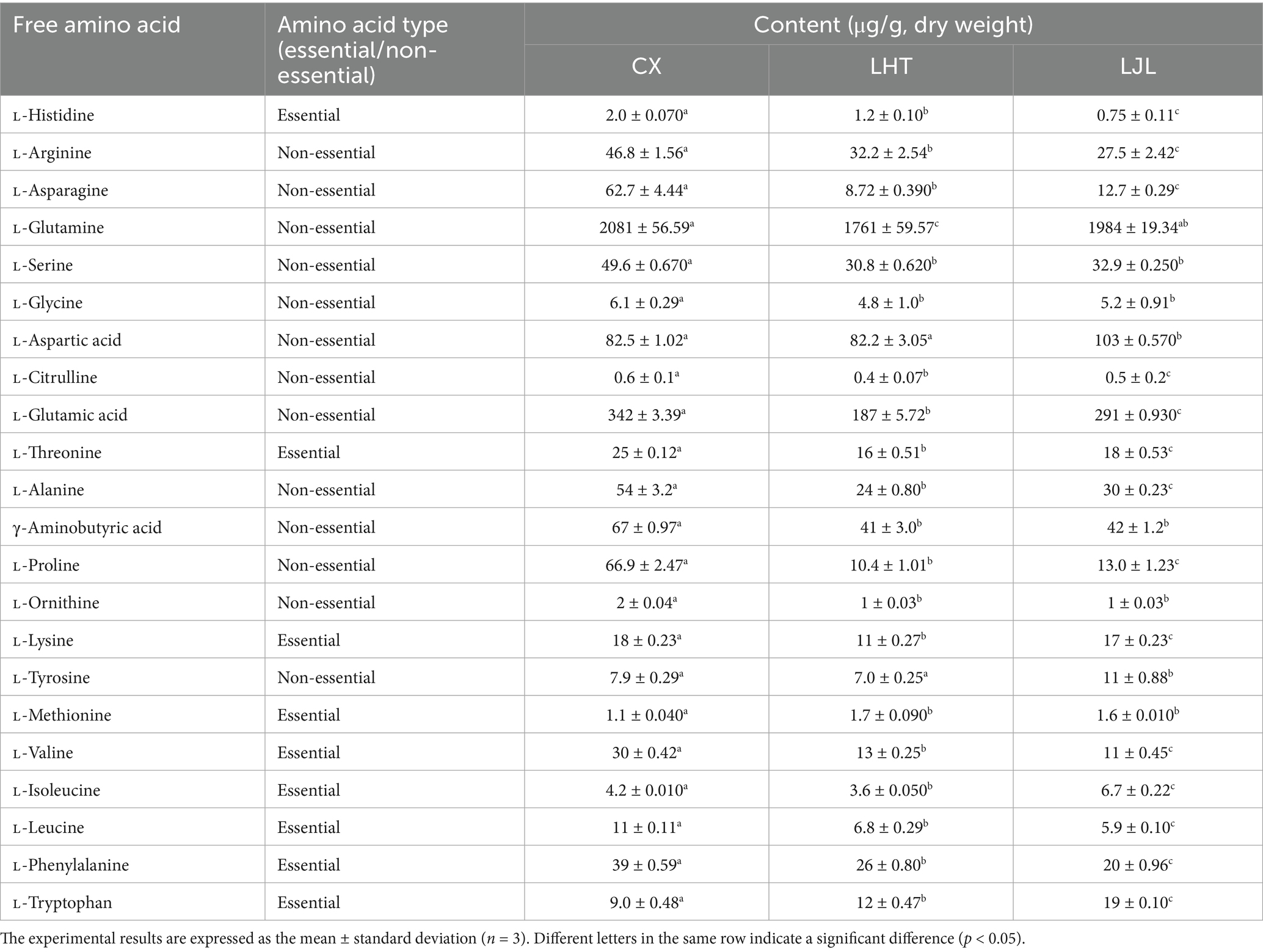 Free amino acids act as key contributors to the sensory characteristics of natural foods, with diverse taste profiles including sourness, sweetness, bitterness, and umami (10). The free amino acid contents of different varieties in blue honeysuckle were shown in Table 2. A complete set of 22 amino acids was measured, consisting of 9 essential amino acids, and 13 non-essential amino acids. Among them, L-glutamine, L-glutamic acid, and L-aspartic acid collectively account for over 80% of the total amino acid content in blue honeysuckle, constituting the primary components of its free amino acid profile. These free amino acids serve as the primary contributors to the umami taste of blue honeysuckle. The contents of L-arginine, L-lysine, L-valine, L-leucine, and L-phenylalanine reached the maximum levels in CX. Based on sensory attributes, the aforementioned amino acids are generally associated with bitterness (22, 25).