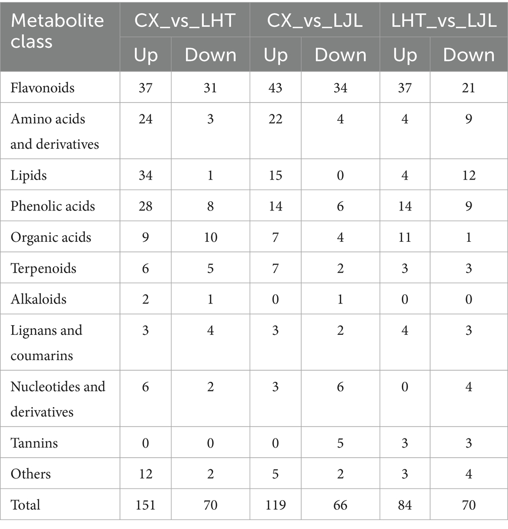Overall, the differentially accumulated metabolites could be broadly divided into two groups (Table 4). The first group of differential metabolites constituted antioxidant components such as flavonoids, alkaloids, phenolic acids, and terpenoids, while the second group included taste-related components such as organic acids, and amino acids and derivatives (29). Most differentially accumulated metabolites of the antioxidant components were found at higher concentrations in CX sample. CX, LHT, and LJL displayed similar metabolite accumulation patterns. There were significant differences in about 20–30% of the metabolites between the various varieties of blue honeysuckle samples, with flavonoids being the major differential metabolites.