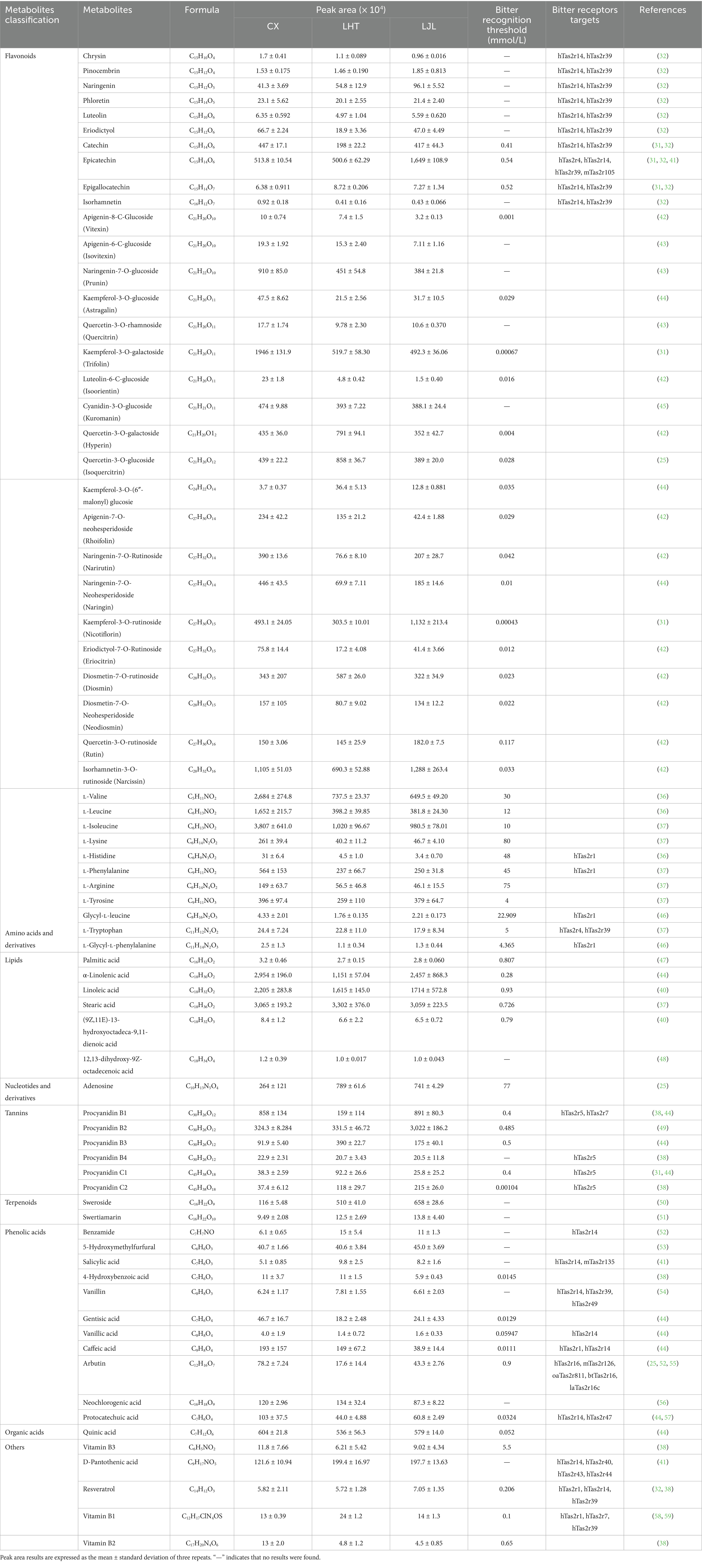 Flavonoids have been systematically characterized as the primary bitter principles in fruits and vegetables (13). Catechin and gallic acid are the main bitter substances in green tea, and catechin, epicatechin, gallic acid, and quercetin serve as key contributors to the increased bitterness in wine (10). According to Table 5, the most diverse types of bitter substances screened from blue honeysuckle were flavonoids (30 species), primarily including chrysin, pinocembrin, naringenin, phloretin, luteolin, eriodictyol, catechin, epicatechin, epigallocatechin, isorhamnetin, apigenin-O-glycosides, naringenin-O-glycosides, kaempferol-O-glycosides, quercetin-O-glycosides, luteolin-O-glycosides, cyanidin-O-glycosides, eriodictyol-O-glycosides, diosmetin-O-glycosides, and isorhamnetin-O-glycosides. Xia et al. (1) similarly identified various flavonoid bitter substances such as anthocyanins, flavan-3-ols, flavanonols, flavones, and flavonols in blue honeysuckle. Epigallocatechin is a common catechin compound found in plant-based foods such as tea, apples, and grapes (31). Catechin is the main component of tea polyphenols, accounting for approximately 75 to 80% of the total polyphenol content in tea (32). The above two substances are one of the primary sources of the bitter and astringent taste of tea. Compared with LJL, epicatechin was significantly down-regulated in CX and LHT (Supplementary Table S1). It has been reported that phenolic acids exhibit a sour and astringent taste, whereas quercetin-3-O-rutinoside has a mild astringent taste. Phenolic acids and quercetin-3-O-rutinoside could enhance the bitterness of catechins (33). Most of the flavonoid bitter metabolites exhibited high bitter intensity. For instance, kaempferol-3-O-galactoside and kaempferol-3-O-rutinoside demonstrated remarkably low bitterness thresholds of 0.00067 mmol/L and 0.00043 mmol/L, respectively, both significantly lower than the widely used bitter reference compound quinine hydrochloride (0.3 mmol/L) (22). The content of eriodictyol, isorhamnetin, kaempferol-3-O-galactoside, luteolin-6-C-glucoside, naringenin-7-O-neohesperidoside, and eriodictyol-7-O-rutinoside showed up-regulated expression in CX (Supplementary Table S1). Thus, these flavonoids may be one of the contributing factors to the intensified bitter taste in the varieties of blue honeysuckle.