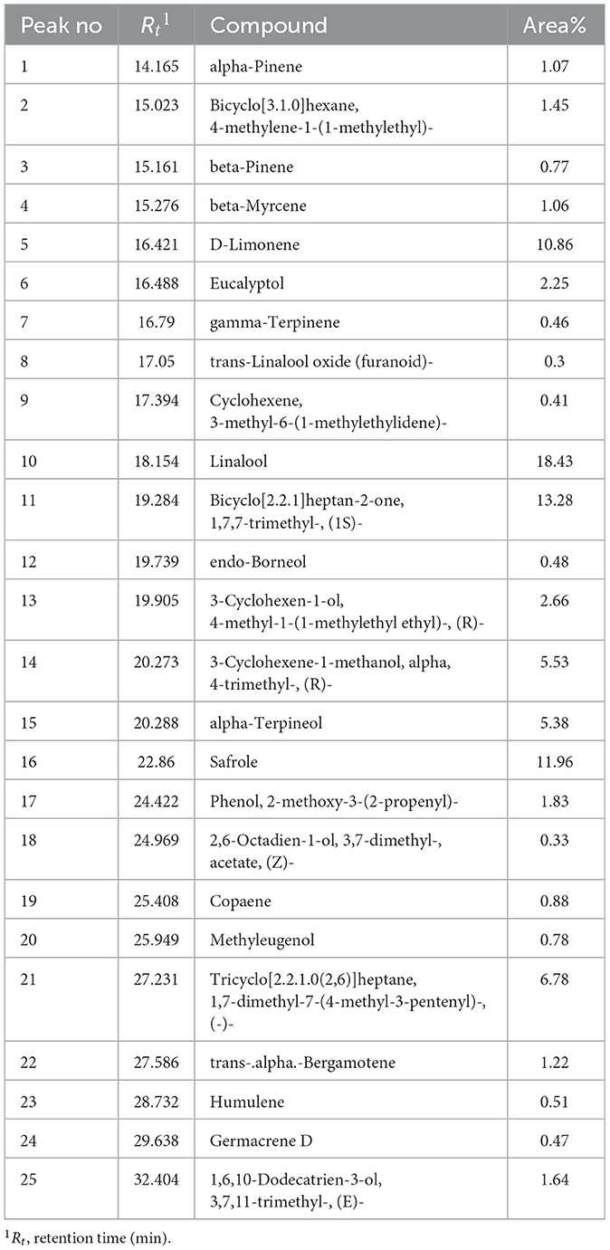 The chemical composition of AAEO was analyzed by GC/MS as shown in Table 1. Only components with concentrations >0.3% are reported. The obtained results indicated the presence of 25 chemical compounds in the chromatogram, constituting 90.79% of the total components detected. The highest compositions of the compounds were 18.43% of Linalool, followed by Bicyclo[2.2.1] heptan-2-one, 1,7,7-trimethyl-, (1S)- (13.28%), Safroleb (11.96%), D-Limonene (10.86%), Tricyclo[2.2.1.0(2, 6)]heptane, 1,7-dimethyl-7-(4-methyl-3-pentenyl)-, (-)- (6.78%), 3-Cyclohexene-1-methanol, alpha.,4-trimethyl-, (R)- (5.53%), and alpha-Terpineol (5.38%).