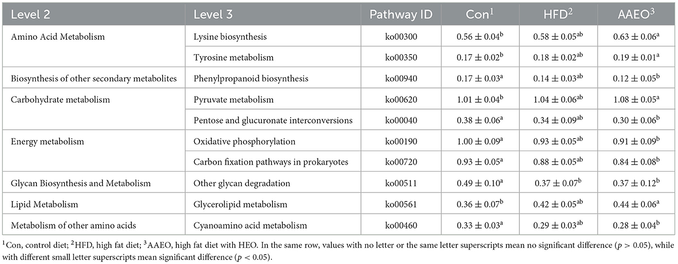 As demonstrated in Figure 1, based on PICRUSt prediction, the microbiota function was predicted; the KEGG pathway in top 10 at level 2 about metabolism included global and overview maps, carbohydrate metabolism, amino acid metabolism, energy metabolism, metabolism of cofactors and vitamins, and nucleotide metabolism et al. in three dietary treatments (Figure 1A). Totally, the PICRUSt predicted 295 pathways in level 3 of fecal samples, among them, only 80 pathways were related to metabolism (level 2). The central pathway in top 10 of level 3 contained five pathways about global and overview maps (as shown in Figure 1B), which were metabolic pathways, biosynthesis of secondary metabolites, microbial metabolism in diverse environments, biosynthesis of amino acids, and carbon metabolism respectively. In addition, the pathways of amino sugar and nucleotide sugar metabolism, glycolysis/gluconeogenesis, starch and sucrose metabolism were associated with carbohydrate metabolism. The purine metabolism and pyrimidine metabolism were associated with nucleotide metabolism at level 3. Finally, the top 10 pathways in KEGG levels 2 and 3 were not notably different (p > 0.05). Analysis of the AAEO's effects on the mouse fecal microbiota demonstrated that it influenced the functional potentials of these microbes (Table 2). Compared to the Con group, the HFD group with AAEO significantly raised (p < 0.05) abundance of lysine biosynthesis, tyrosine metabolism, pyruvate metabolism, and glycerolipid metabolism related with amino acid, carbohydrate, and lipid metabolism. On the contrary, the HFD group with AAEO significantly decreased (p < 0.05) abundance of phenylpropanoid biosynthesis, pentose and glucuronate interconversions, oxidative phosphorylation, carbon fixation pathways in prokaryotes, and cyanoamino acid metabolism than Con group. Although HFD significantly increased the abundance of the other glycan degradation pathway associated with glycan biosynthesis and metabolism (p < 0.05), the addition of AAEO to HFD had no effect on it (p > 0.05).