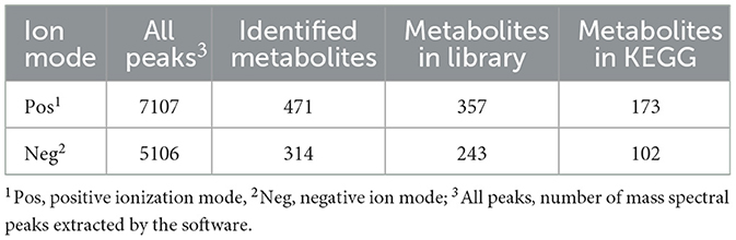 As shown in Table 3, a total of 7,107 positive ion mass spectrometry peaks and 5,106 negative ion mass spectrometry peaks were identified by LC-MS/MS non-targeted metabolomics; 357 positive ion metabolites and 243 negative ion metabolites compared to public databases; and 173 positive ion metabolites and 102 negative ion metabolites compared to KEGG database.