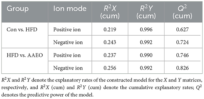 The parameters of the OPLS-DA models for positive and negative ionization were listed in Table 4. The closer the R2Y and Q2 were to 1, the more stable and reliable the model was, Q2 > 0.5 indicated a better predictive ability of the model, and Q2 < 0.5 indicated a poorer predictive ability of the model. As can be seen from the table, the cumulative explanatory rate of R2Y for the comparison between the two groups in both the positive and negative ion modes exceed 0.9, indicating that at least 90% of the variance in the Y-measure can be explained by these OPLS-DA models. The Q2 calculated by cross-validation showed that the predictions of the OPLS-DA models were good for all groups. In particular, the R2Y and Q2 between the Con vs. HFD groups were close to 1, indicating that the HFD-induced obesity model in this study, modeling was successful. In addition, Q2 > 0.5 between the HFD vs. AAEO groups indicated that ingestion of AAEO could successfully modulate the metabolite composition caused by HFD.