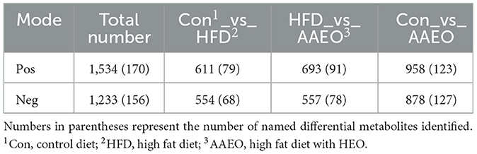 Screening was performed based on the variable importance of projection (VIP) analysis obtained from the OPLS-DA model. Metabolites with VIP value >1 and p-value < 0.05 were considered as significantly different metabolites between the two groups. Table 5 showed the number of significantly different metabolites from the comparative analysis between the two groups. A total of 170 significantly different metabolites were identified in the positive ion mode and 156 significantly different metabolites were identified in the negative ion mode. Compared with the Con group, there were 79 significantly different metabolites in the positive ion mode and 68 in the negative ion mode in the HFD group, and 123 significantly different metabolites in the positive ion mode and 127 in the negative ion mode in the AAEO group. Compared with HFD, there were 91 significantly different metabolites in positive ion mode and 78 significantly different metabolites in negative ion mode in the AAEO group.