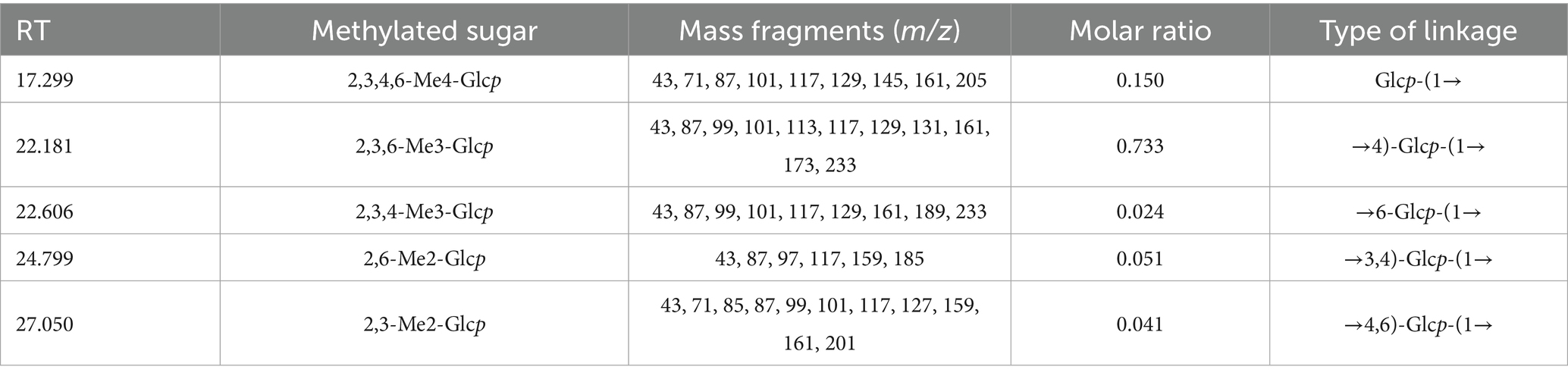 Methylation analysis is widely used to determine polysaccharide structure. The method involves converting the individual constituent sugars in polysaccharides into partially methylated alditol acetates, which are then analysed and quantified by GC–MS. The proposed method enables the identification of attachment sites and molar ratios of different sugar residues. The results of the methylation analysis are presented in Table 1 and Figure 2C. Based on the GC–MS spectral database (Agilent), retention times of each peak, main characteristic fragments and published spectral analysis results (30, 34), we identified five different glycosidic bonds in GP-1, T-Glcp-(1→, →4)-Glcp-(1→, →6-Glcp-(1→, →3,4)-Glcp-(1 → and →4,6)-Glcp- (1→, with molar ratio of 0.150:0.733: 0.024:0.051:0.041.