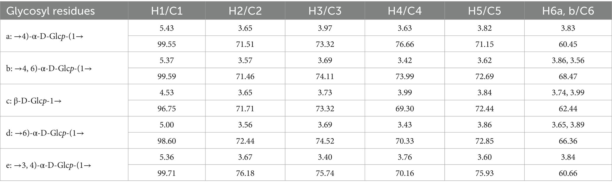 All the glycosidic bonds were in the α-conformation except for c: β-D-Glcp-1→, which exhibited an isohead carbon signal at 4.53 and adopted a β-conformation. In the HMBC spectrum, a correlation peak was observed between C-4 of the b: →4,6)-α-D-Glcp-(1 → glycosidic bond and H-1 of the a: →4)-α-D-Glcp-(1 → glycosidic bond, indicating the presence of the →4)-α-D-Glcp-(1 → 4,6)-α-D- Glcp-(1 → glycosidic bond. Similarly, a correlation peak was observed between C-4 of the e: →3,4)-α-D-Glcp-(1 → glycosidic bond and H-1 of the a: →4)-α-D- Glcp-(1 → glycosidic bond, indicating the presence of the →4)-α-D-Glcp-(1 → 3,4)- α-D-Glcp-(1 → glycosidic bond. Furthermore, a correlation peak was detected between C-1 of the c: β-D-Glcp-1 → glycosidic bond and H-6 of the d: →6)-α-D- Glcp-(1 → glycosidic bond, indicating the presence of the β-D-Glcp-(1 → 6)-α-D- Glcp-(1 → glycosidic bond, as shown in Figure 3F.