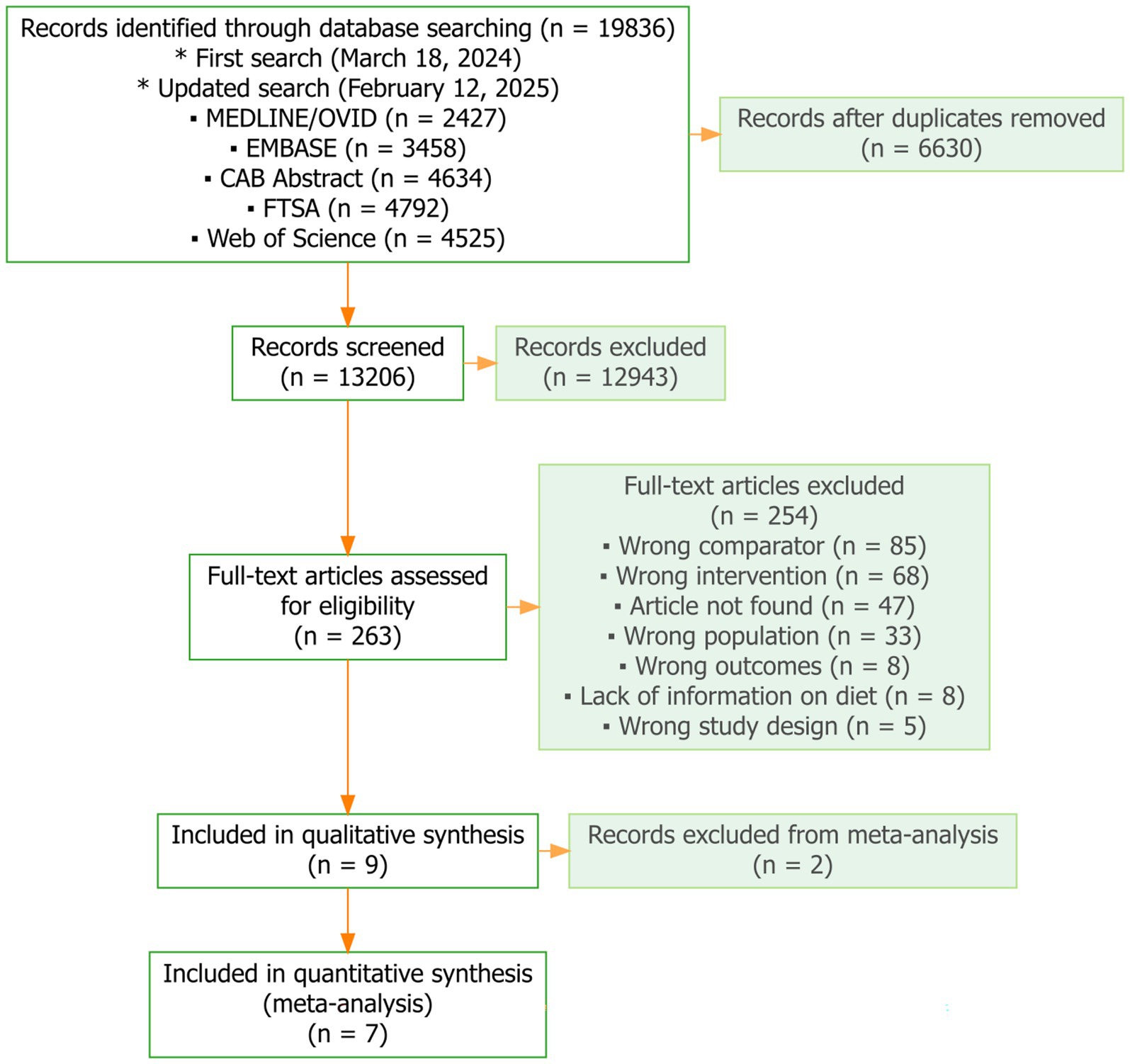 Flowchart illustrating the process of the systematic review. Initially, 19,836 records were identified through database searching. After removing duplicates, 6,630 records remained. Of these, 13,206 were screened, with 12,943 excluded. A total of 263 full-text articles were assessed for eligibility, and 254 were excluded for reasons such as wrong comparator, wrong intervention, and article not found. Nine studies were included in the qualitative synthesis, and seven in the quantitative synthesis, with two records excluded from the meta-analysis.