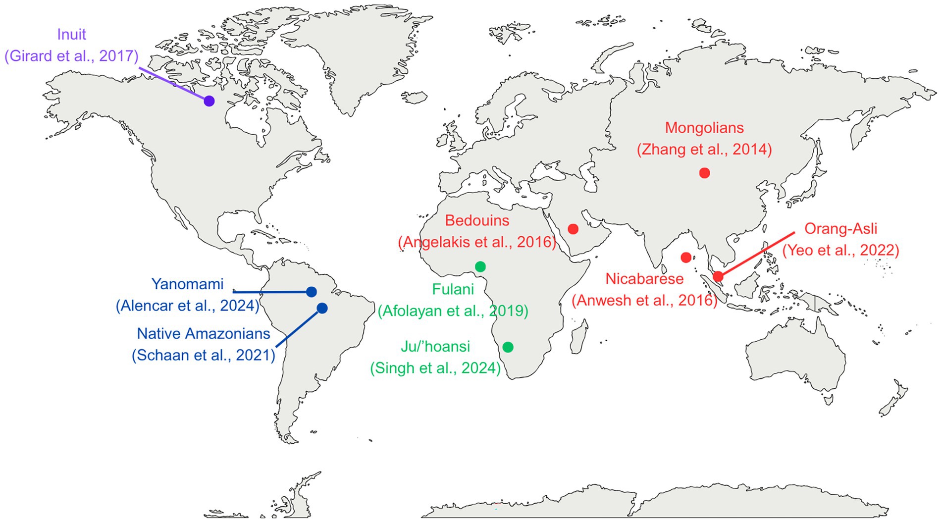 World map highlighting various Indigenous groups and their locations with corresponding studies. The Inuit are noted in North America (Girard et al., 2017), followed by Yanomami (Alencar et al., 2024) and Native Amazonians (Schaan et al., 2021) in South America. Bedouins (Angelakis et al., 2016) and Fulani (Afolayan et al., 2019) are marked in Africa, with Ju’/hoansi (Singh et al., 2024) also in Africa. In Asia, Mongolians (Zhang et al., 2014), Nicabarese (Anwesh et al., 2016), and Orang-Asli (Yeo et al., 2022) are indicated. Different colors and labels are used for each group.