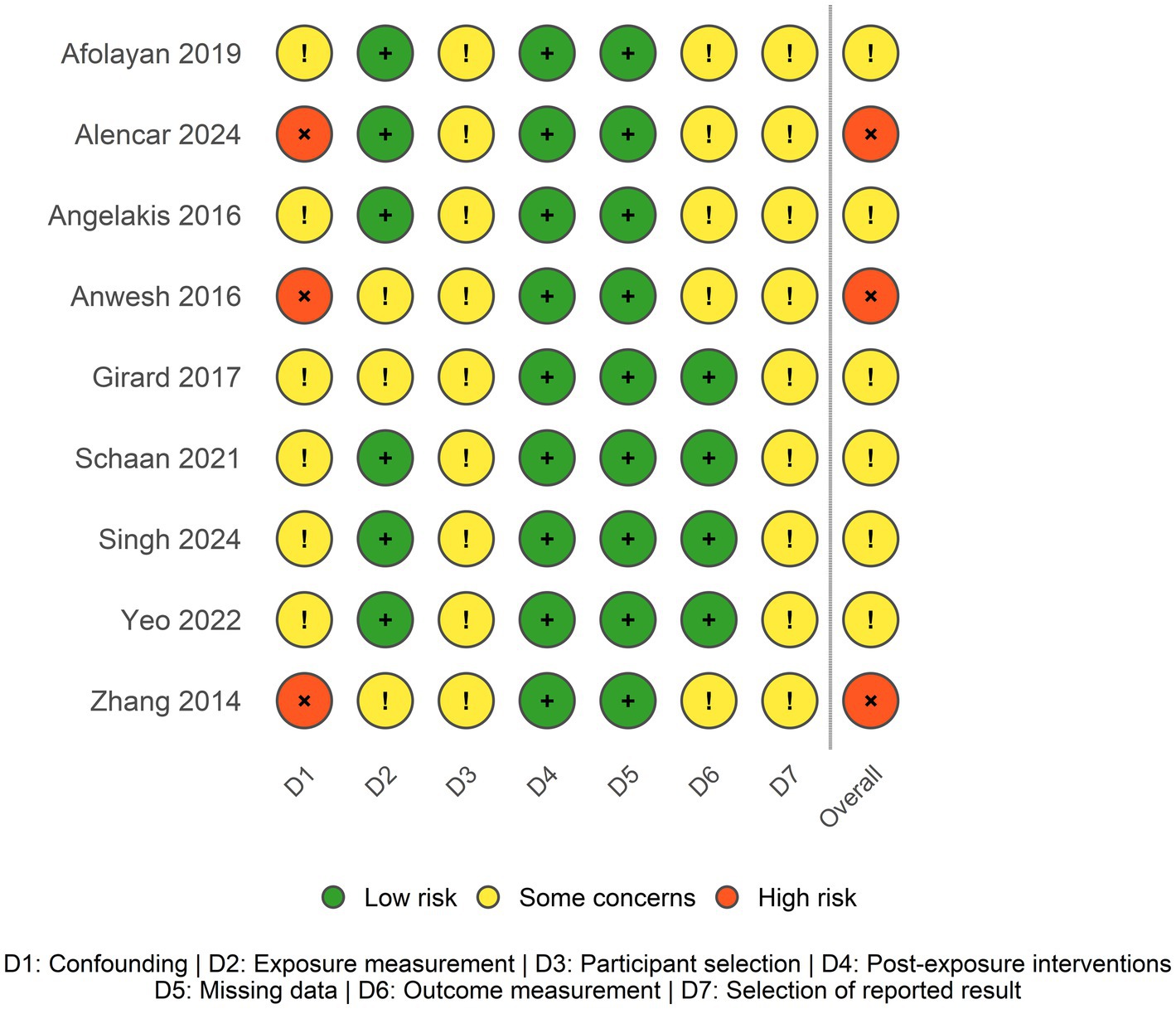 We evaluated the risk of bias in the included studies using the ROBINS-E (Risk Of Bias In Non-randomized Studies of Exposures) criteria. Based on the latest version of ROBINS-E, the most relevant signaling questions for assessing the risk of bias in the eligible studies were retained for bias analysis. Each signaling question could have responses of: No (N), Probably No (PN), Yes (Y), and Probably Yes (PY). The signaling questions belonged to different domains of bias, namely: (D1) confounding, (D2) exposure measurement, (D3) participant selection, (D4) post-exposure interventions, (D5) missing data, (D6) outcome measurements, (D7) selective reporting.