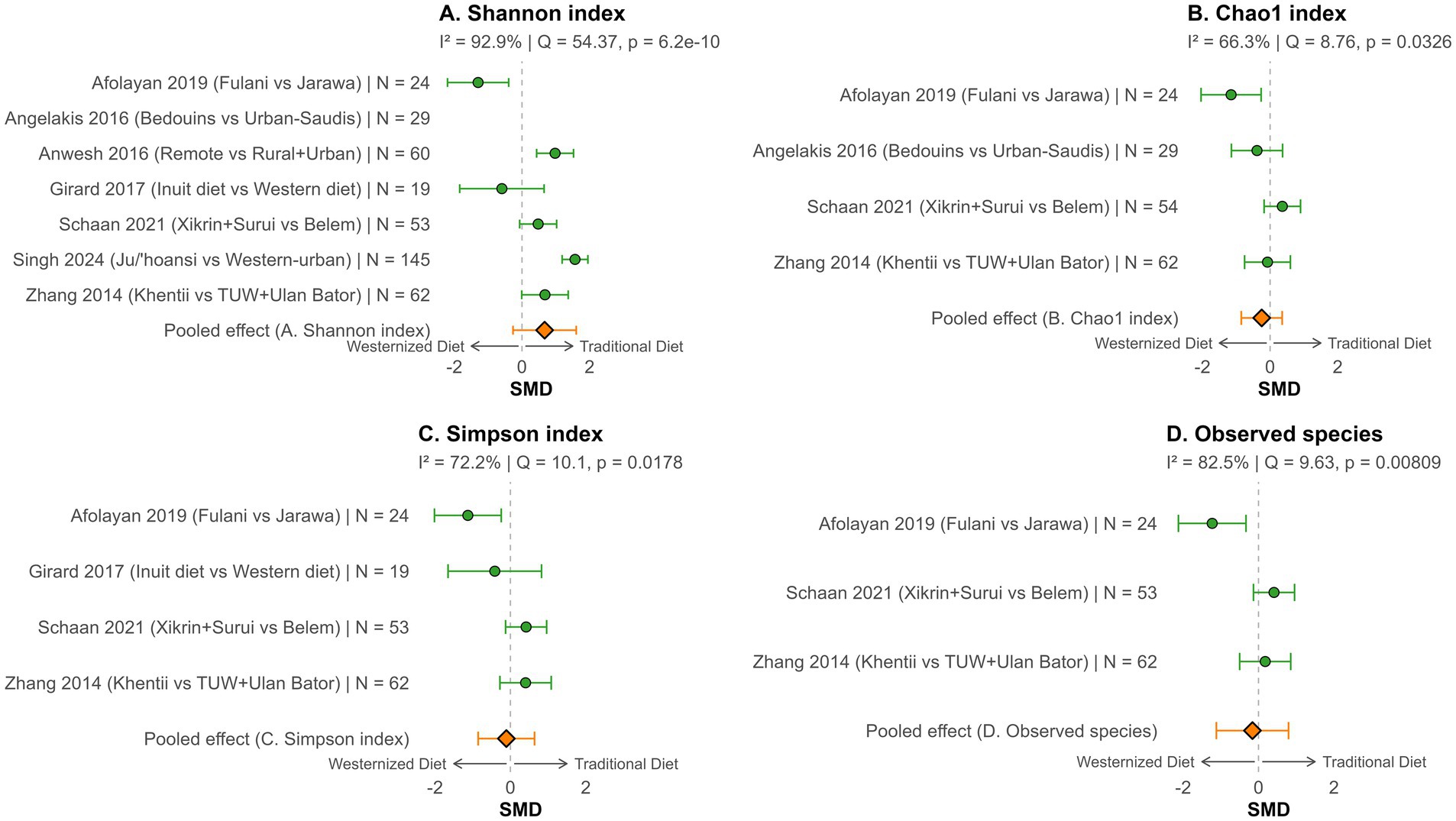 Figure 4. Gut microbiota diversity differences associated with dietary westernization in Indigenous populations: meta-analysis. Forest plots showing SMD in alpha-diversity indices—(A) Shannon, (B) Chao1, (C) Simpson, (D) Observed species—between Indigenous adults adhering to traditional versus westernized dietary patterns. Positive SMD values indicate higher diversity under traditional diets. Pooled estimates (orange diamonds) and study weights are shown. I2 values represent the percentage of total variation across studies due to heterogeneity rather than chance, with higher values (>75%) indicating considerable heterogeneity. SMD, standardized mean difference; I2, heterogeneity; Q, Cochran’s Q; N, sample size.