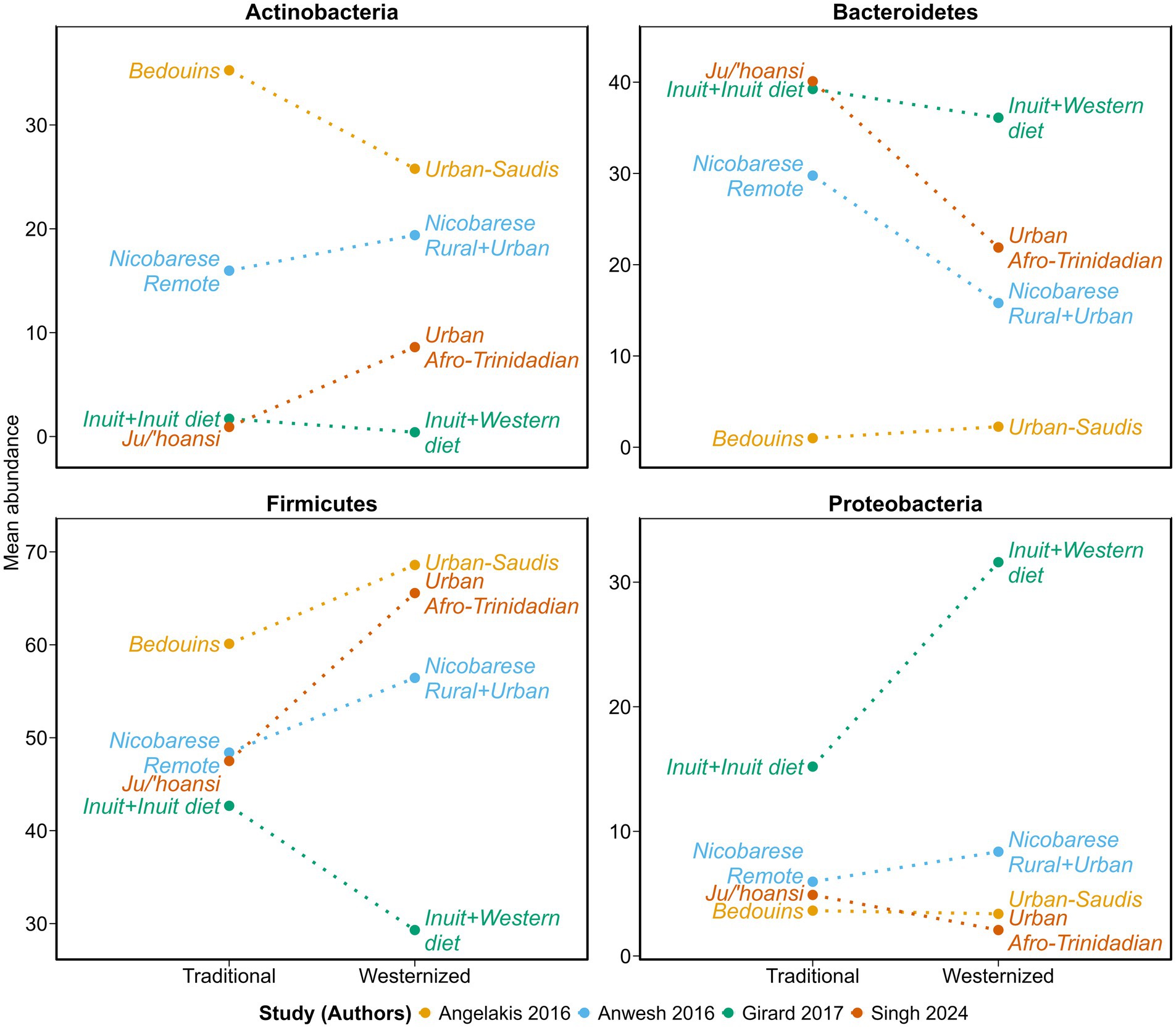Figure 5. Phylum-level differences associated with dietary westernization in Indigenous populations. Slopegraphs showing the relative mean abundance of four dominant bacterial phyla—Actinobacteria, Bacteroidetes, Firmicutes, and Proteobacteria—in traditional vs. westernized groups across four independent studies (Angelakis (62); Anwesh (63); Girard (26); Singh (57)). Line colors differentiate studies. Points represent study-specific group means, and labels indicate the original group names used in each publication. Dotted lines are used to emphasize that values represent independent groups (traditional vs. westernized), and not repeated measurements within the same group (i.e., not longitudinal changes).