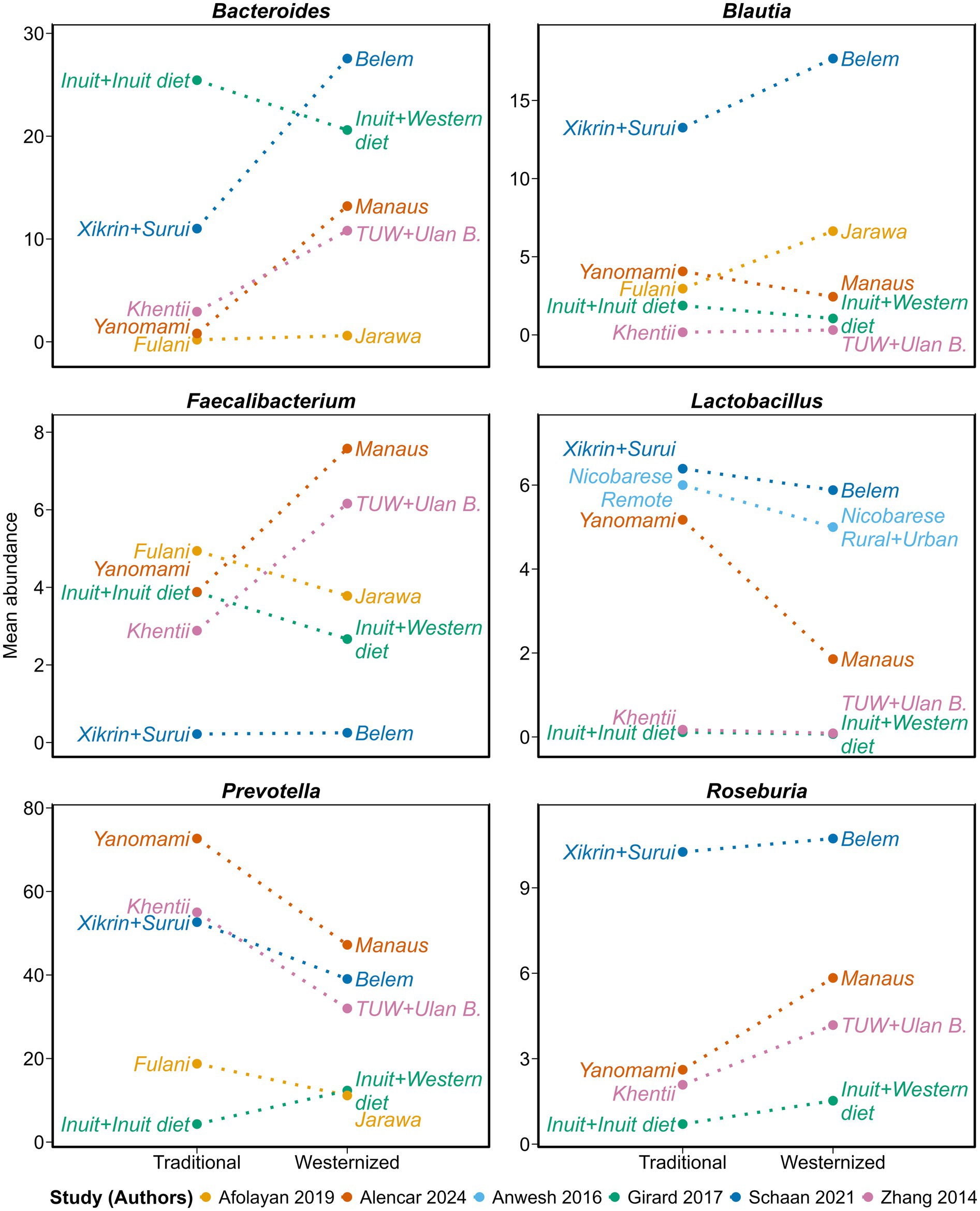Figure 6. Genus-level differences associated with dietary westernization in Indigenous populations. Slopegraphs showing the relative mean abundance of six dominant bacterial genera—Bacteroides, Blautia, Faecalibacterium, Lactobacillus, Prevotella, and Roseburia—in traditional versus westernized groups across six independent studies (Afolayan (56); Alencar (59); Anwesh (63); Girard (26); Schaan (58); Zhang (61)). Line colors differentiate studies. Points represent study-specific group means, and labels indicate the original group names used in each publication. Dotted lines are used to emphasize that values represent independent groups (traditional vs. westernized), and not repeated measurements within the same group (i.e., not longitudinal changes).