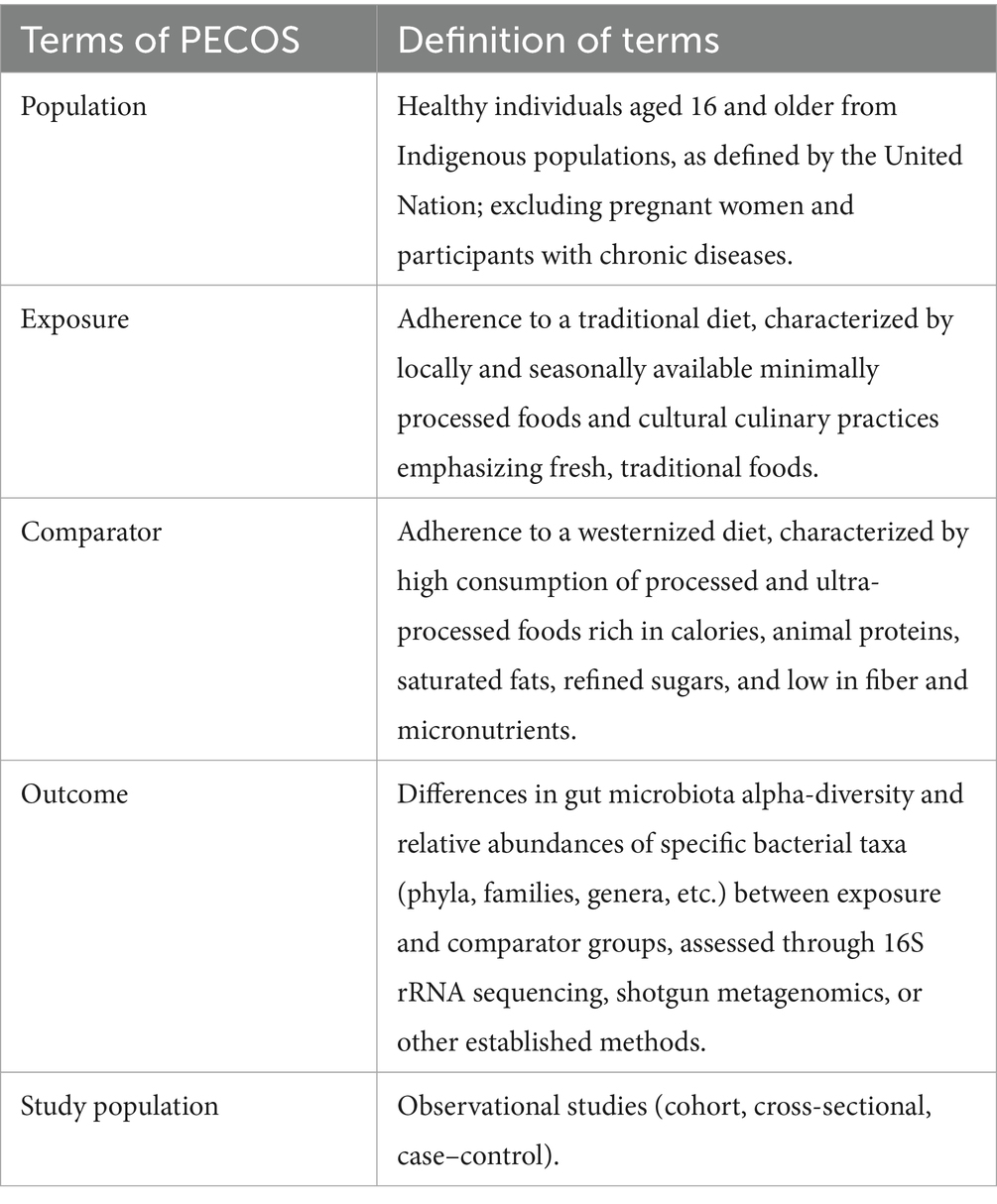 Eligible studies compared gut microbiota composition and diversity between individuals adhering to traditional versus less traditional or westernized dietary patterns within Indigenous communities. In the present study, we define “traditional diets” as the customary dietary practices historically followed by the Indigenous populations under study. These diets are shaped by long-standing ecological, cultural, and subsistence patterns and typically consist of locally available, minimally processed foods prepared using traditional methods. While the content of these diets varies across groups—ranging from hunter-gatherer to horticultural and agrarian food systems—they are unified by their continuity with pre-industrial foodways and their central role in cultural identity and social organization (40, 49, 50).