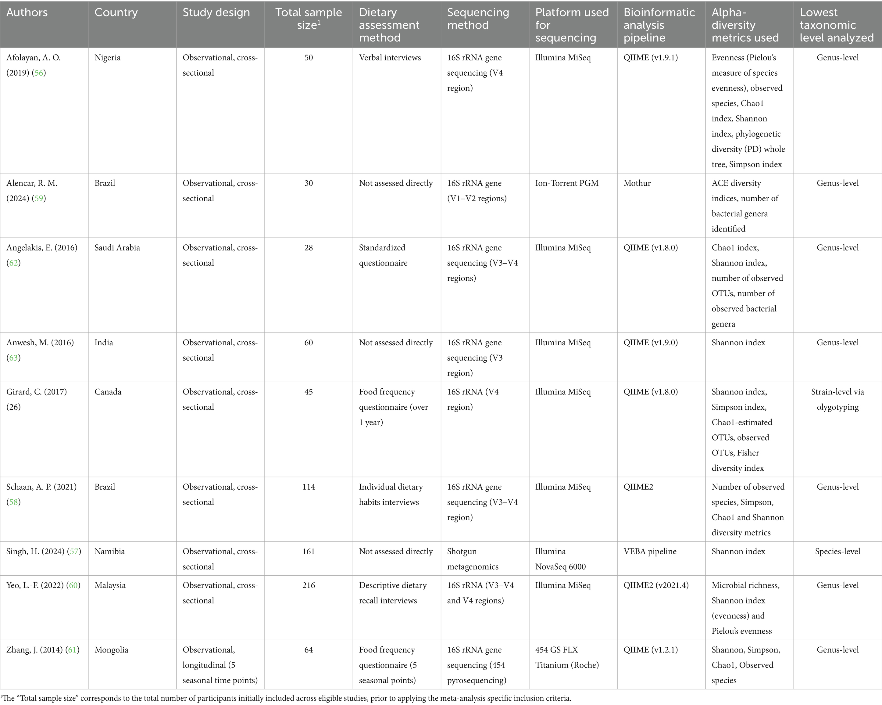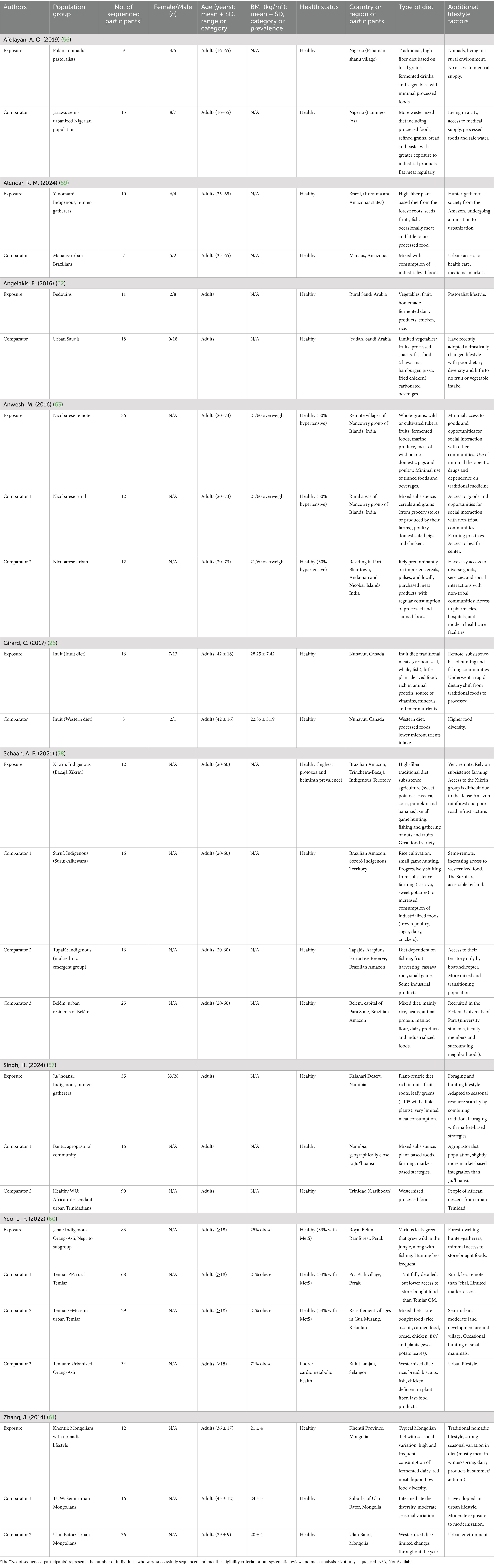 Dietary assessment methods varied across studies. Three studies used dietary questionnaires: an annual dietary habit questionnaire (26), a standardized questionnaire (62), and a food frequency questionnaire assessing long-term dietary intake (61). Three other studies relied on interviews to describe dietary habits (56, 58, 60), with one justifying this choice by the low literacy level of participants (60). Finally, three studies (57, 59, 63) inferred dietary patterns from lifestyle and community descriptions, without explicit mention of interviews or structured questionnaires. Traditional diets were generally composed of high-fiber, minimally processed foods (e.g., tubers, wild plants, fruits, fish, fermented foods) except for the traditional Inuit diet which was essentially animal-based (33, 40, 41), while westernized diets included refined carbohydrates, meats, dairy products, and industrially processed foods. Most studies used 16S rRNA gene sequencing to characterize the gut microbiota, while one study (57) used shotgun metagenomics. Alpha-diversity was assessed in all studies, mainly using Shannon and Chao1 indices. Taxonomic resolution typically reached the phylum or genus-level, and one study (57) included species-level analysis. The methodological characteristics of the studies are detailed in Table 2 and participant characteristics are summarized in Table 3.