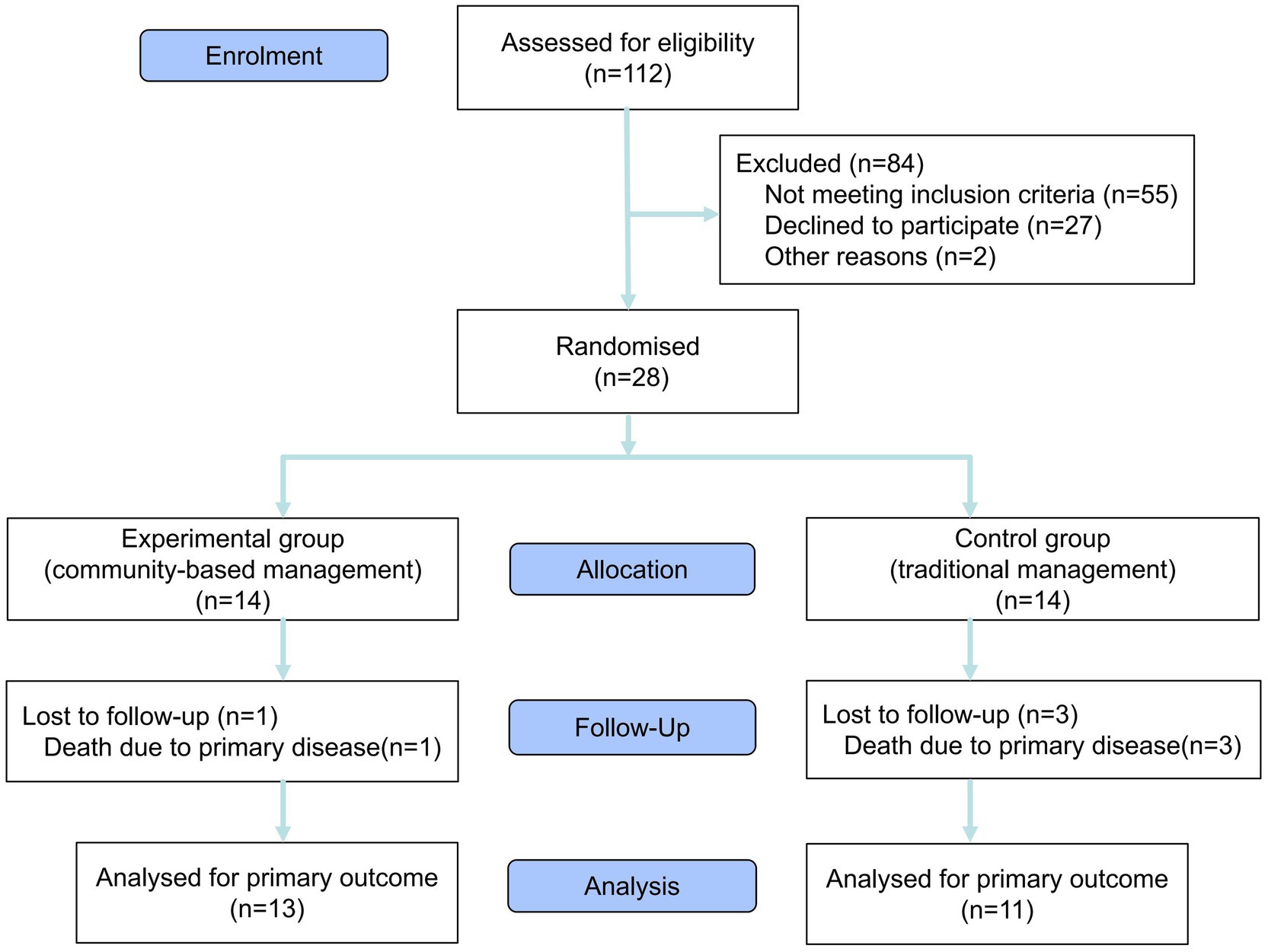 Methods: This prospective randomized controlled trial assigned patients to either an experimental group receiving community-based management or a control group receiving traditional management. Health status was evaluated through laboratory parameters, body composition analysis, anthropometric measurements, and standardized scale assessments.