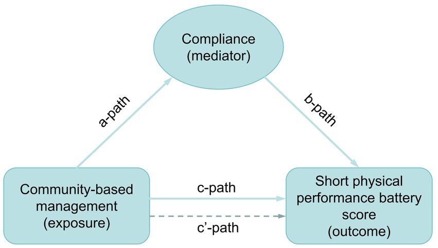 Data from all 24 patients who completed the trial—13 in the experimental group and 11 in the control group—were included in the statistical analysis. Descriptive analysis was conducted by classifying study variables as either continuous or categorical. Dialysis duration, treated as a continuous variable, is presented as mean and standard deviation. The remaining demographic data and clinical variables were treated as categorical and expressed as frequency and percentage. Statistical differences in categorical variables were assessed using two-sided Fisher’s exact probability tests, while differences in continuous variables were evaluated using the Kruskal–Wallis rank sum test. The management model of the NST was further analyzed using a one-sided Fisher’s exact probability test to assess associations across all outcome measures, including ALB, P, HGB, muscle mass, visceral fat area, SPPB score, and compliance. Statistically significant outcomes (ALB, P, HGB, muscle mass, visceral fat area, and SPPB) were reanalyzed in relation to compliance using a one-sided Fisher’s exact probability test. Compliance was examined as a potential mediator in the relationship between the NST management model and SPPB score. The overall effect of the association between management model (exposure) and SPPB score (outcome) was evaluated through pathway c’. Mediation analysis was conducted through three distinct paths: pathway a evaluated the association between management model and compliance; pathway b assessed the relationship between compliance and SPPB score; and pathway c (direct effect) examined the influence of compliance on the relationship between management model and SPPB score (Figure 2). The mediation effect ratio was calculated as (mediation effect/total effect) × 100. The Karson-Holm-Breen (KHB) method was applied to test the significance of the mediation effect. Furthermore, the impact of demographic factors on compliance was examined. Differences in categorical variables were analyzed using Fisher’s exact probability test, while Kendall’s correlation was used for continuous variables.