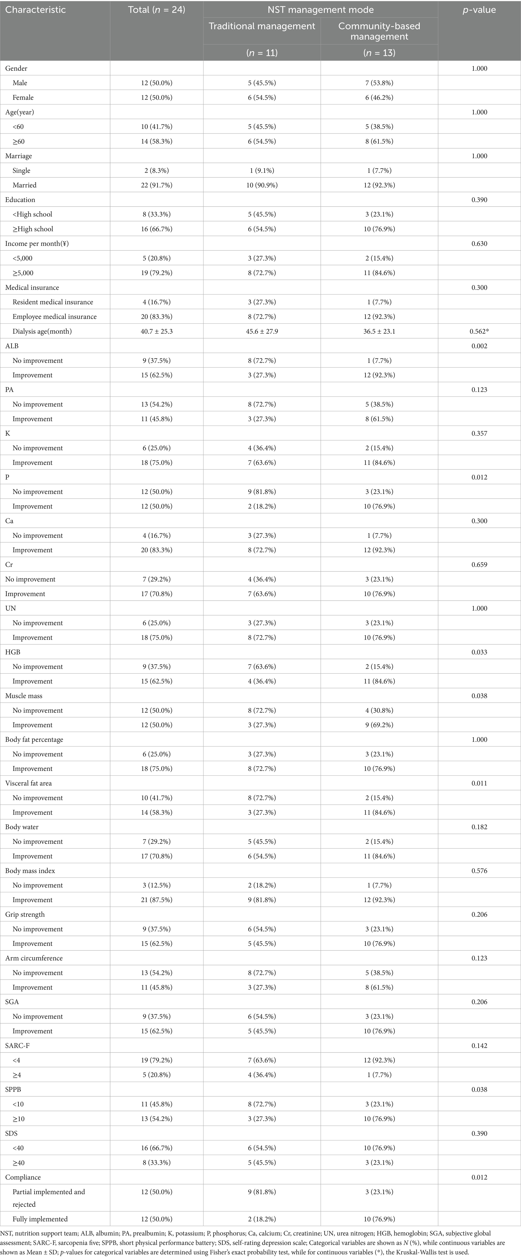 Malnutrition is prevalent among dialysis patients (36) and is driven by numerous risk factors, including uremia, dialysis-related complications, inflammation, acidosis, endocrine disorders, nutrient loss during treatment, psychological conditions, reduced physical activity, intestinal dysbiosis, and anorexia (6, 43). In patients with ESRD, malnutrition is associated with diminished quality of life and increased mortality risk (6, 44). Therefore, implementation of preventive and targeted nutritional interventions remains critical for addressing malnutrition. Evidence from existing studies demonstrates that nutrition-focused strategies, particularly those involving dietitian guidance, considerably improve nutritional status and physical function in patients (45–47). However, hyperphosphatemia continues to present clinical challenges (48). In this study, the community-based management group achieved superior control of serum P levels compared to the traditional management group (10 patients, 76.9% versus 2 patients, 18.2%; p = 0.012), highlighting the effectiveness of the community-based management model. The integration of nutritional interventions within this framework contributed to enhanced outcomes. Notably, greater improvements in ALB levels (12 patients, 92.3% versus 3 patients, 27.3%, p = 0.002) and HGB levels (11 patients, 84.6% versus 4 patients, 36.4%, p = 0.033) were observed in the community-based management group compared to the traditional management group, further supporting the clinical benefits of this approach.