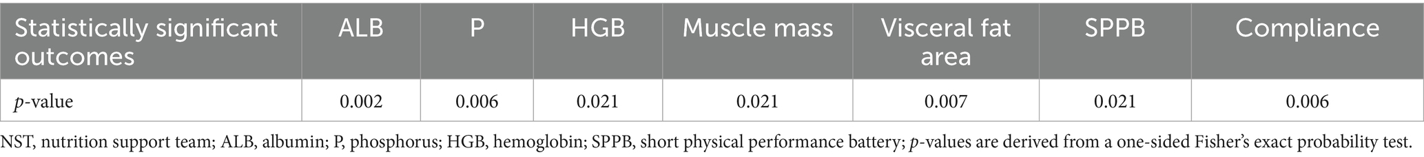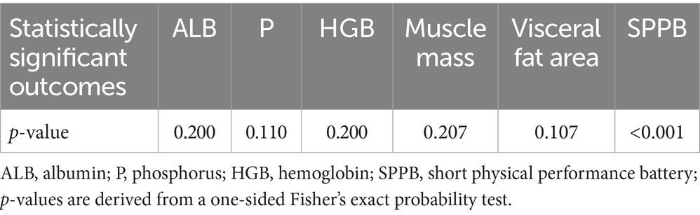 Among 24 participants who completed the trial, 12 (50%) were males and 12 (50%) were females. Ten (41.7%) participants were under 60 years of age, while 14 (58.3%) were aged 60 years or older. Two participants (8.3%) were single, and 22 (91.7%) cohabited with a partner. Sixteen (66.7%) participants attained a high school education or above, whereas eight (33.3%) participants did not complete high school. Regarding monthly income, five (20.8%) participants earned less than ¥5,000, and 19 (79.2%) earned more than ¥5,000. Four (16.7%) participants were enrolled in resident medical insurance, while 20 (83.3%) were covered by employee medical insurance. The mean age since initiation of dialysis was 40.7 ± 25.3 months. Utilizing Fisher’s exact probability test, seven indicators exhibited statistically significant differences (p < 0.05). These included three laboratory parameters: ALB (p = 0.002), P (p = 0.012), and HGB (p = 0.033); two body composition measures: muscle mass (p = 0.038) and visceral fat area (p = 0.011); one functional assessment: the SPPB score (p = 0.038); and compliance (p = 0.012) (Table 1 provides details).